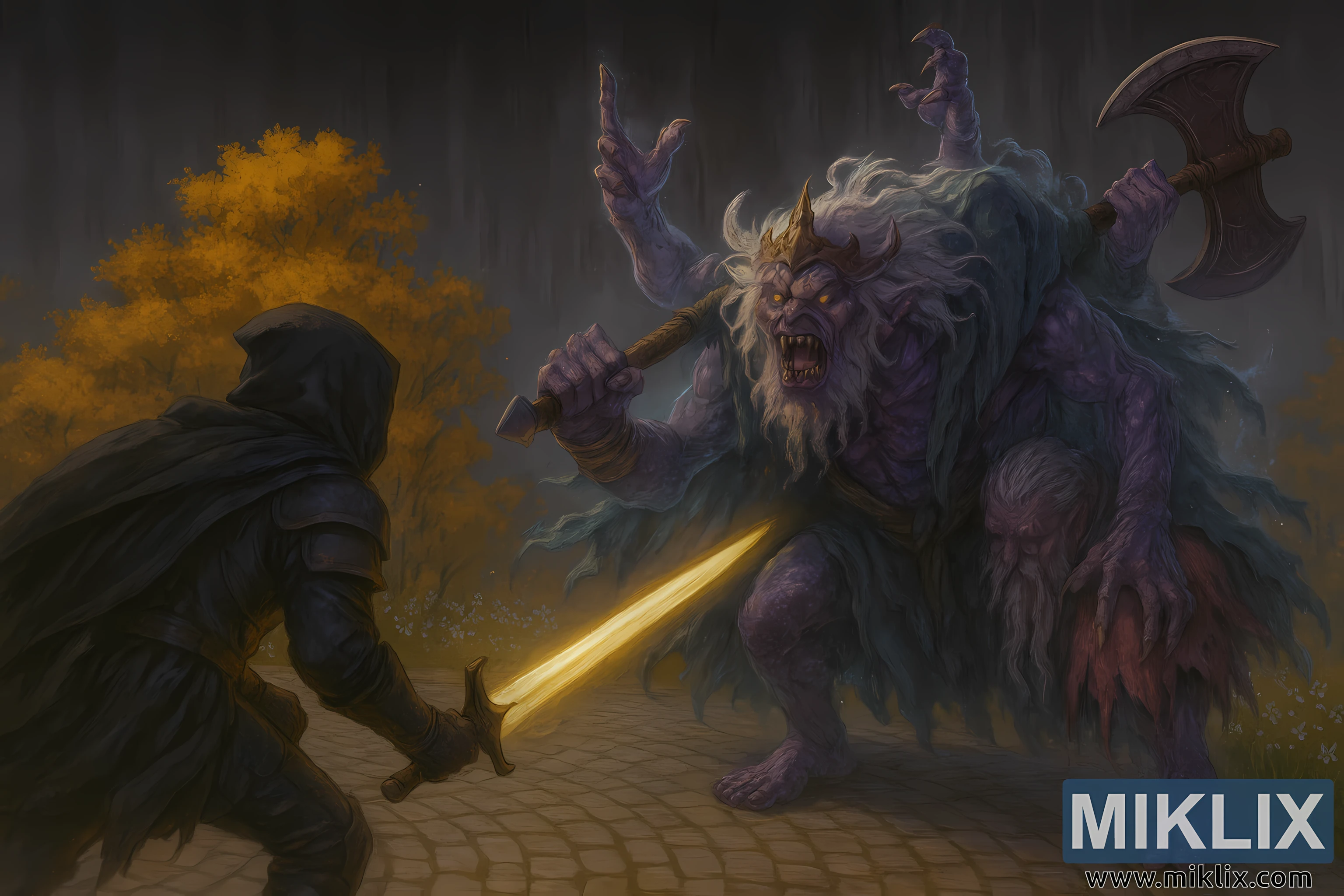 영화적인 구도와 균형감이 돋보이는 이 장면은 플랫폼을 사이에 두고 대각선으로 마주 보고 있는 두 인물을 묘사합니다. 빛나는 검과 황금빛 나뭇잎은 고드프루아의 유령 같은 투명함과 폭풍우 치는 하늘과 선명한 대비를 이룹니다. 마법의 에너지가 전투원 주위를 은은하게 휘감고 있으며, 방사형으로 배열된 자갈길은 보는 이의 시선을 전투의 중심부로 이끌어갑니다. 이 이미지는 공포, 판타지, 그리고 현실감을 풍부하고 세밀하게 표현한 시각적 서사를 통해 엘든 링의 상징적인 전투를 생생하고 몰입감 있게 묘사합니다.