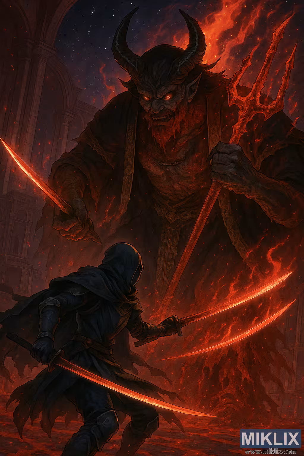 그 위로는 별빛이 흩뿌려진 공허가 펼쳐져 있다. 짙은 파란색과 검은색에 희미한 천상의 빛이 점처럼 흩뿌려져 있는데, 이는 용암처럼 빛나는 등장인물들의 모습과 극명한 대조를 이룬다. 우주의 고요함과 솟아오르는 불꽃의 병치는 극적인 시각적 긴장감을 조성하며, 이 결투가 신화적이면서도 최후의 순간임을 더욱 강조한다. 이 이미지는 폭력과 운명 사이에 얼어붙은 순간을 포착한다. 불꽃과 폐허의 성당에서 우뚝 솟은 혈혈단주에 맞서 홀로 선 암살자 같은 전사의 모습이다.