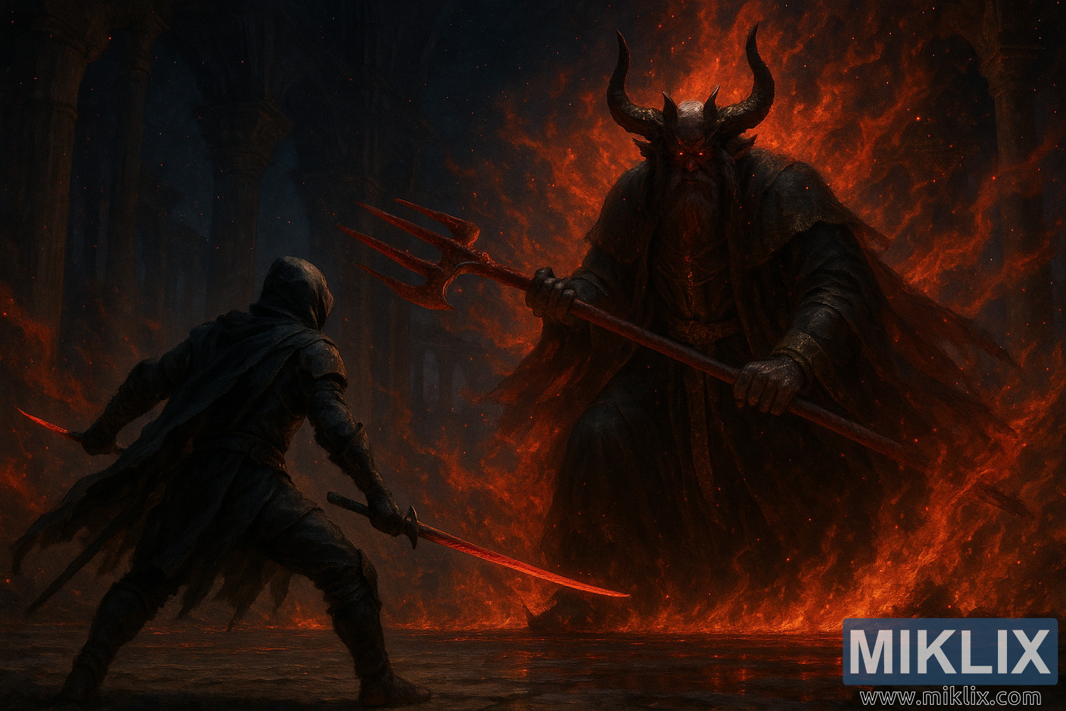 불타는 성당을 배경으로 피의 군주 모그와 맞서는 전사의 어두운 판타지 장면으로, 두 개의 칼날과 거대한 삼지창이 등장합니다.
