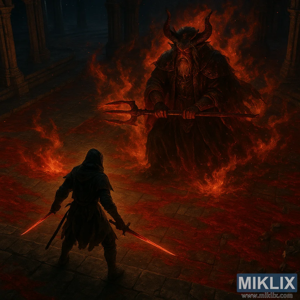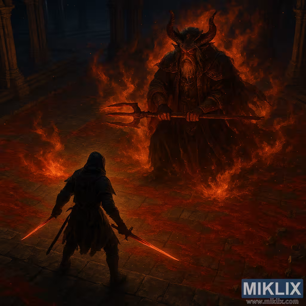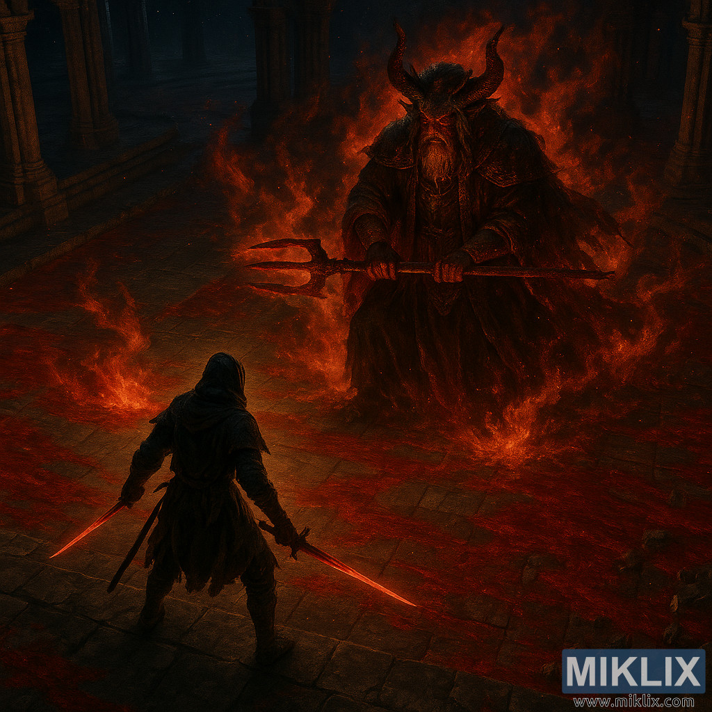 화면 위쪽 절반은 피의 군주 모그가 장악하고 있다. 그는 거대하고 고대의 모습을 하고 있으며, 휘몰아치는 피의 불꽃에 휩싸인 거대한 형체로, 그 불꽃은 소용돌이치는 불길의 혀처럼 바깥쪽으로 퍼져 나간다. 그의 무거운 의식용 예복은 마치 살아있는 수의처럼 그를 감싸고 있으며, 검은 천에는 잉걸불과 너덜너덜한 가장자리가 줄무늬처럼 보인다. 뒤틀린 뿔이 두개골에서 뾰족하게 솟아올라 의식적인 강렬함으로 타오르는 붉은 눈을 감싸고 있다. 그를 둘러싼 불꽃은 아래에서 그의 형체를 비추며, 수염, 팔뚝, 그리고 화려한 무늬의 옷에 번쩍이는 하이라이트를 드리운다.