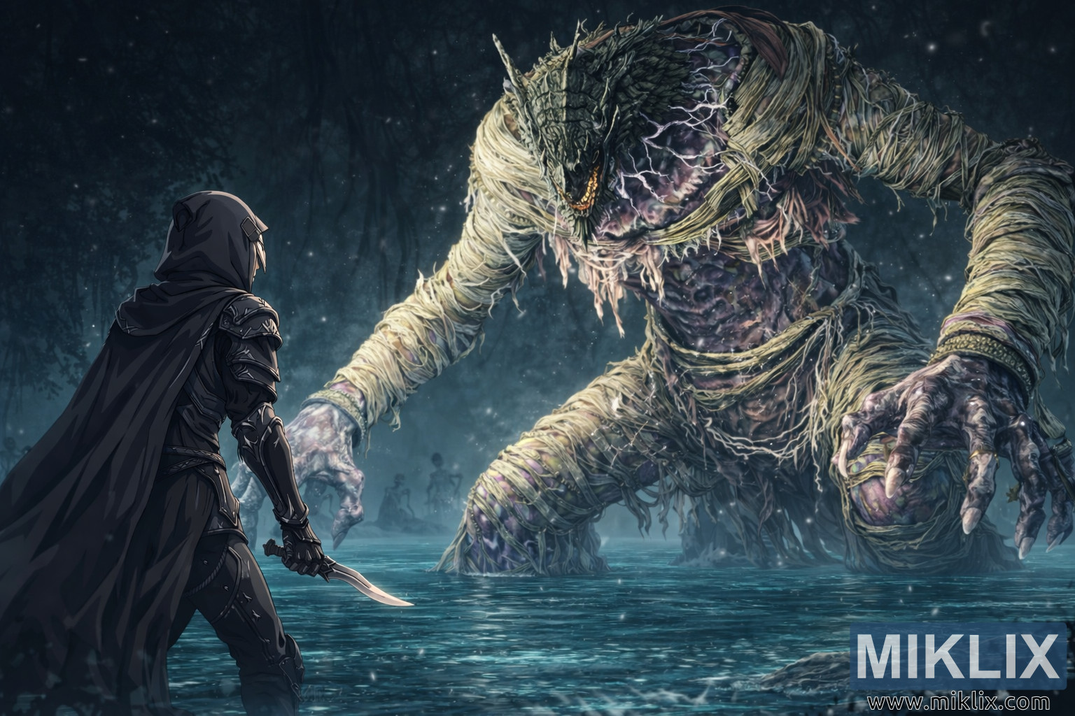 주변 환경이 긴장감을 고조시킨다. 동굴은 광활하고 그림자가 드리워져 있으며, 돌벽은 위로 갈수록 어둠 속으로 사라지고, 안개가 자욱하게 피어오르고 빛 알갱이들이 공중에 떠 있다. 강물은 은은한 생물 발광을 내뿜으며 갑옷, 붕대, 돌에 잔물결을 드리운다. 멀리 배경에는 희미한 인간형 실루엣들—아마도 고대 조각상이나 생명 없는 형상들—이 부분적으로 물에 잠겨 서 있어 녹스텔라의 으스스하고 잊혀진 분위기를 더한다. 구도는 규모와 긴장감을 강조한다. 타락한 자는 결연해 보이지만 연약해 보이며, 괴물 같은 용족 병사에게 왜소하게 가려져 있다. 두 인물은 긴장된 순간에 멈춰선 듯하다. 이 이미지는 폭력이 폭발하기 직전의 정확한 순간을 포착하여 엘든 링의 음산한 지하 세계에서 경외감, 공포, 그리고 결의를 동시에 전달한다.
