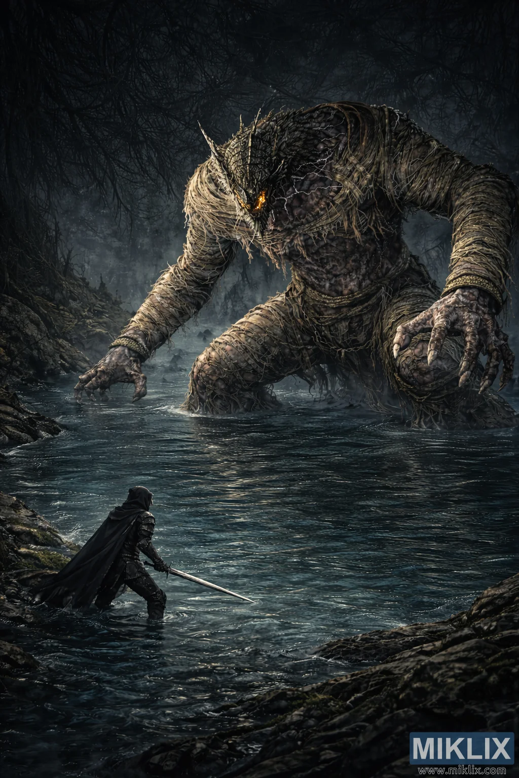 녹스텔라의 용족 병사가 이전보다 훨씬 더 큰 크기로 묘사되어, 그 아래 타락한 자는 거의 보잘것없어 보일 정도다. 용족은 화면 상단을 장악하고 있으며, 거대한 몸은 마치 살아있는 폐허처럼 강에서 솟아오르고 있다. 구부정한 몸통만 해도 타락한 자의 키보다 몇 배나 크고, 거대한 팔은 각각 타락한 자를 완전히 감쌀 만큼 크다. 용족의 몸은 오래되고 썩어가는 붕대로 단단히 감싸져 있는데, 붕대는 늘어지고 찢어져 그 아래로 타락하고 얼룩덜룩한 살점이 드러난다. 창백하고 억제된 번개 줄기가 드러난 가슴과 어깨를 희미하게 가로지르며, 엄청난 힘이 간신히 억제되고 있음을 암시한다. 거칠고 돌 같은 비늘로 덮인 용의 머리는 타락한 자 위로 높이 솟아 있으며, 마치 포식자처럼 아래를 내려다보며 심판하는 듯한 시선을 보내고 있다. 희미한 황색 빛이 눈에서 뿜어져 나와 아래에 홀로 서 있는 도전자에게 집중되어 있다.