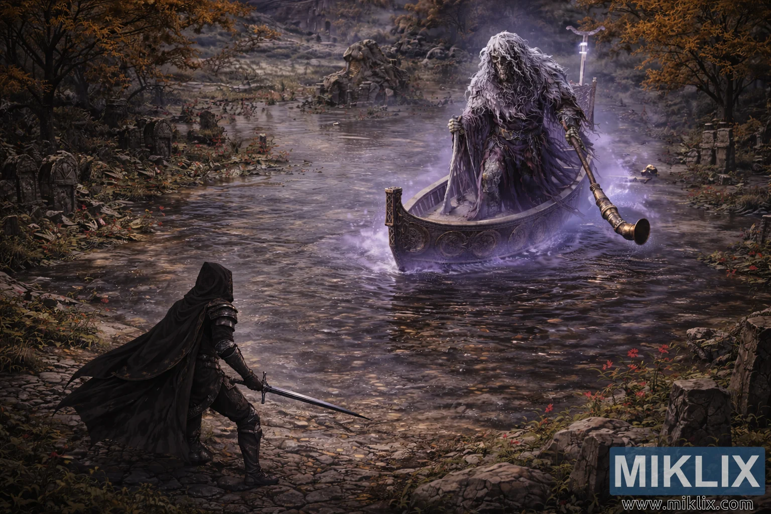 화면 오른쪽 중간쯤, 물에 잠긴 공터의 상당 부분을 차지하는 곳에 해골 같은 모습의 뱃사공 두목이 좁고 화려한 나무배에서 솟아오르고 있다. 배는 마치 아무런 추진력 없이 미끄러지듯 나아가고 있다. 크게 부풀려진 형체는 주변 풍경을 압도하는 위압감을 자아낸다. 은은한 보라색과 잿빛이 감도는 너덜너덜한 옷자락은 겹겹이 드리워져 가장자리는 희미한 안개처럼 퍼져 나간다. 길게 늘어진 흰 머리카락은 해골 같은 얼굴 위로 쏟아져 내리고, 움푹 들어간 눈구멍은 희미한 빛을 발한다. 뱃사공은 의식용 지팡이처럼 생긴 길쭉한 노를 움켜쥐고 있는데, 금속으로 된 노끝은 차가운 빛을 반사한다. 배의 바닥과 형체의 하의에서 은은한 보라색 기운이 뿜어져 나와 물결을 일으키고, 그 물결은 동심원처럼 퍼져 나가며 유령의 초자연적인 무게감을 더욱 강조한다.