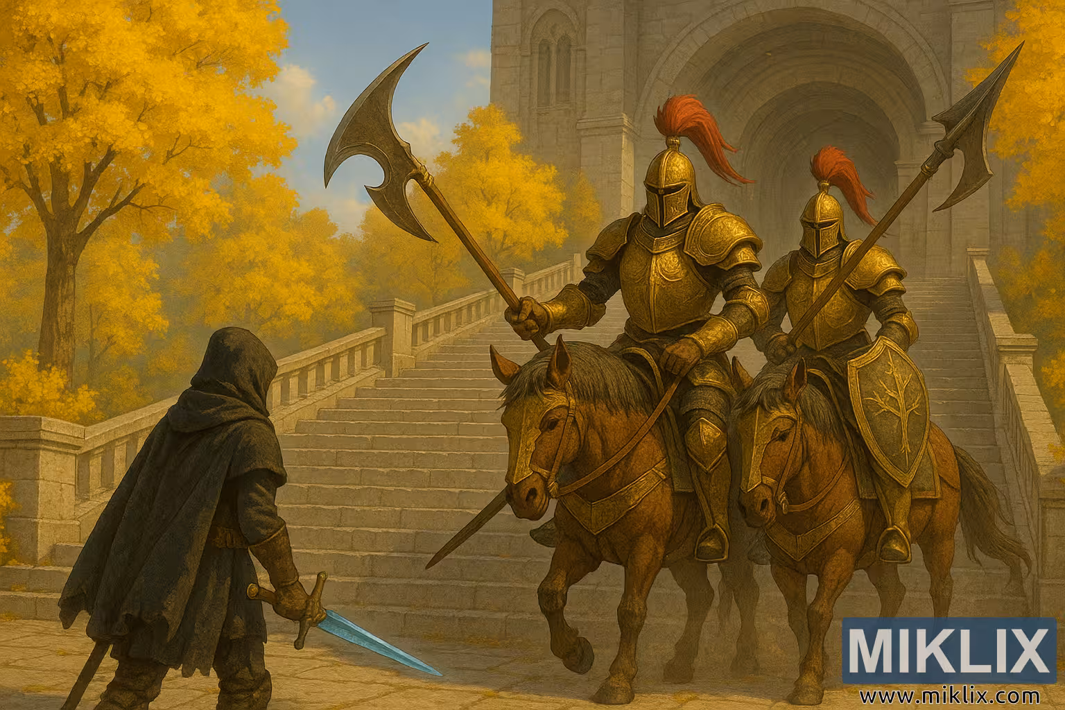 오른쪽, 장면의 중앙과 중간쯤에는 두 명의 나무 파수꾼이 중무장한 군마를 타고 나란히 계단을 내려오고 있다. 두 기사 모두 화려한 금박 갑옷을 입고 있는데, 갑옷은 거울처럼 반짝이기보다는 은은하게 바랜 듯한 광택을 띠며 수도를 오랫동안 지켜왔음을 암시한다. 매끄럽고 둥근 어깨 보호대, 강화된 흉갑, 그리고 섬세한 조각 장식은 그들의 실루엣에 무게감과 위엄을 더한다. 각 파수꾼은 선명한 진홍색 깃털 장식이 달린 투구를 쓰고 있는데, 깃털은 화려한 색감과 움직임을 담아 뒤로 휘어져 있다.