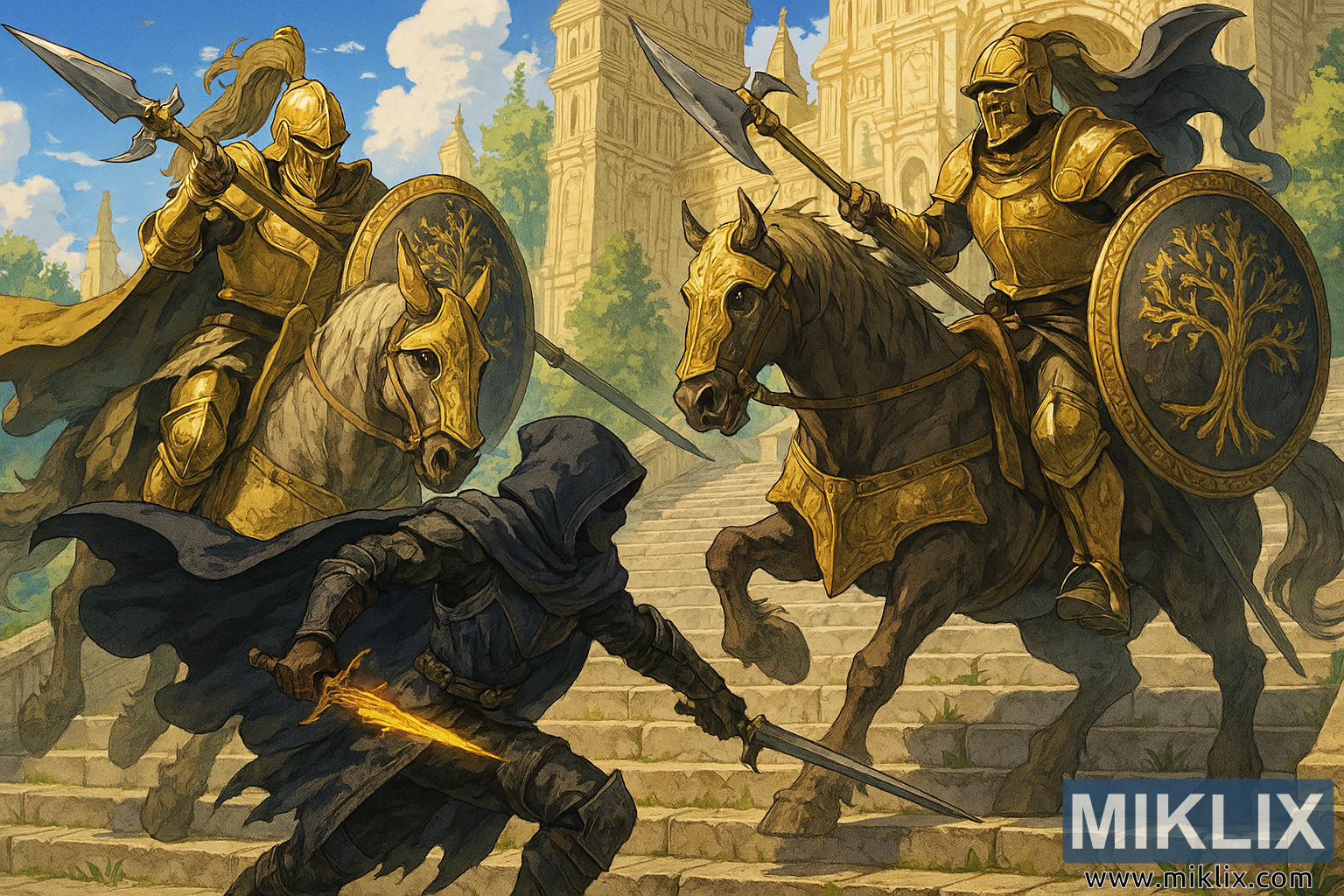 그의 맞은편에는 각각 중무장한 황금빛 말에 올라탄 두 명의 위풍당당한 나무 파수꾼이 서 있다. 파수꾼들은 화려한 문양이 새겨진 찬란한 금박 갑옷과 휘날리는 망토를 걸치고 있다. 투구로 얼굴을 가리고 있지만, 좁혀진 눈빛은 위협과 결의를 드러낸다. 각 파수꾼은 한 손에는 거대한 미늘창을, 다른 한 손에는 커다란 원형 방패를 들고 있다. 방패에는 상징적인 황금 나무 문양이 새겨져 있고, 테두리는 정교한 세공으로 장식되어 있다. 햇빛에 반짝이는 미늘창의 굽은 날은 치명적인 일격을 위해 겨누어져 있다.