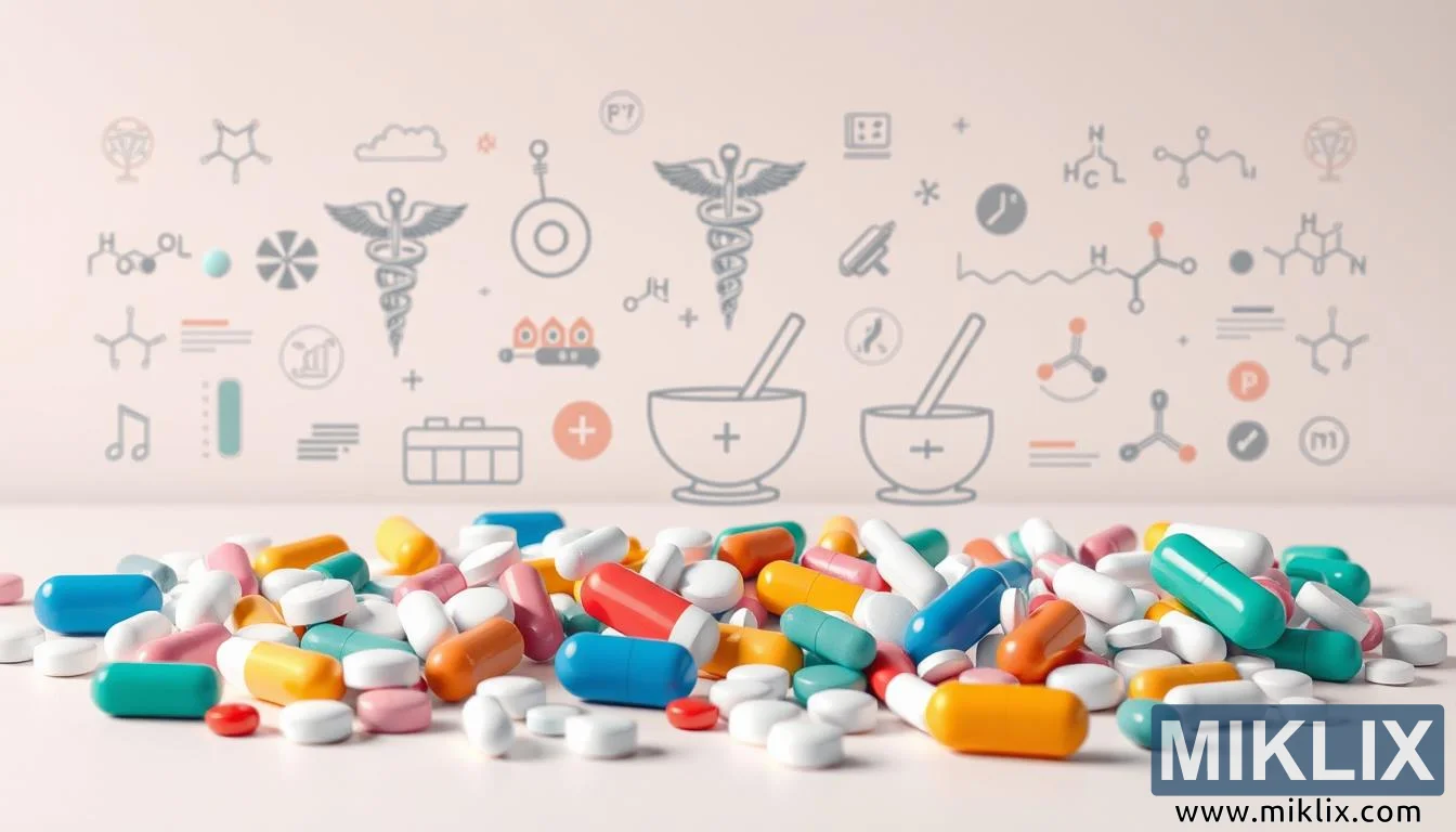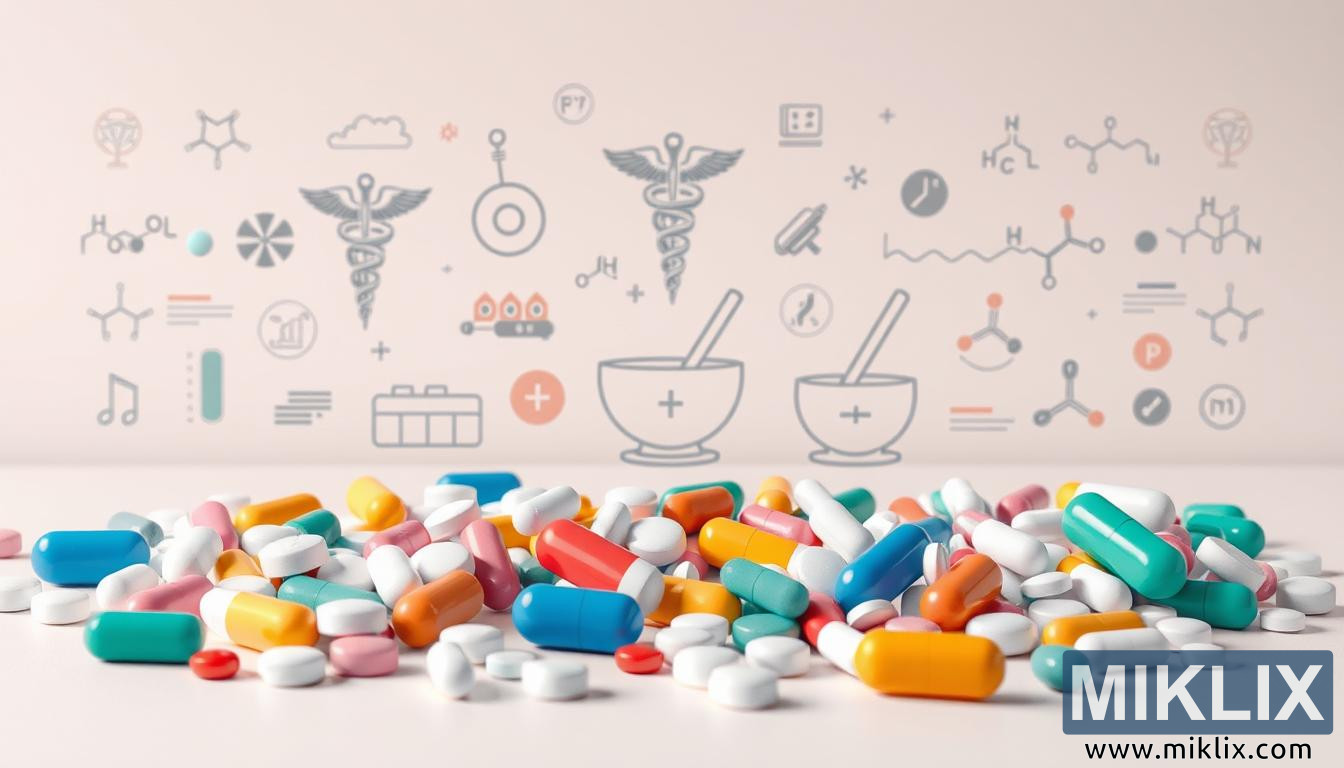 약물 상호작용의 복잡한 본질을 강조하는 알약, 캡슐 및 의료 기호의 역동적인 일러스트레이션입니다.