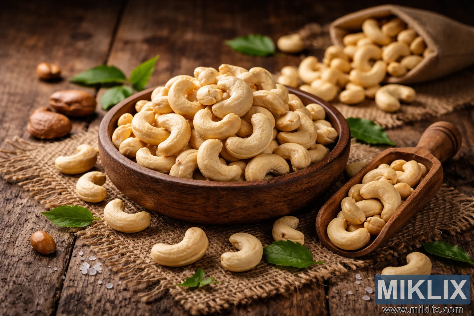 오래된 나무 테이블 위에 삼베 장식과 따뜻한 조명 아래 캐슈넛이 담긴 나무 그릇과 스쿱을 보여주는 고해상도 소박한 음식 사진.