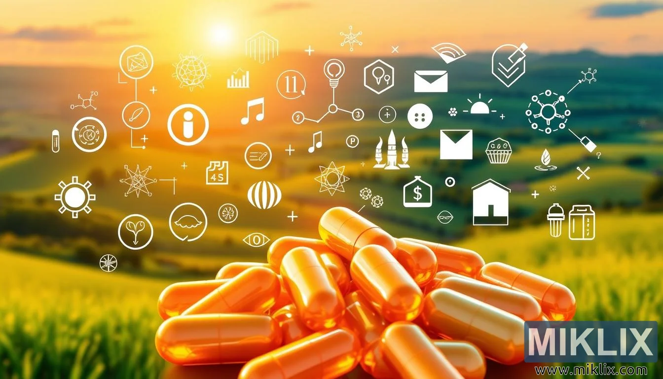차분한 목가적 풍경 속에 트립토판 캡슐, 분자 구조, 웰빙 아이콘을 표현한 고해상도 일러스트레이션입니다.