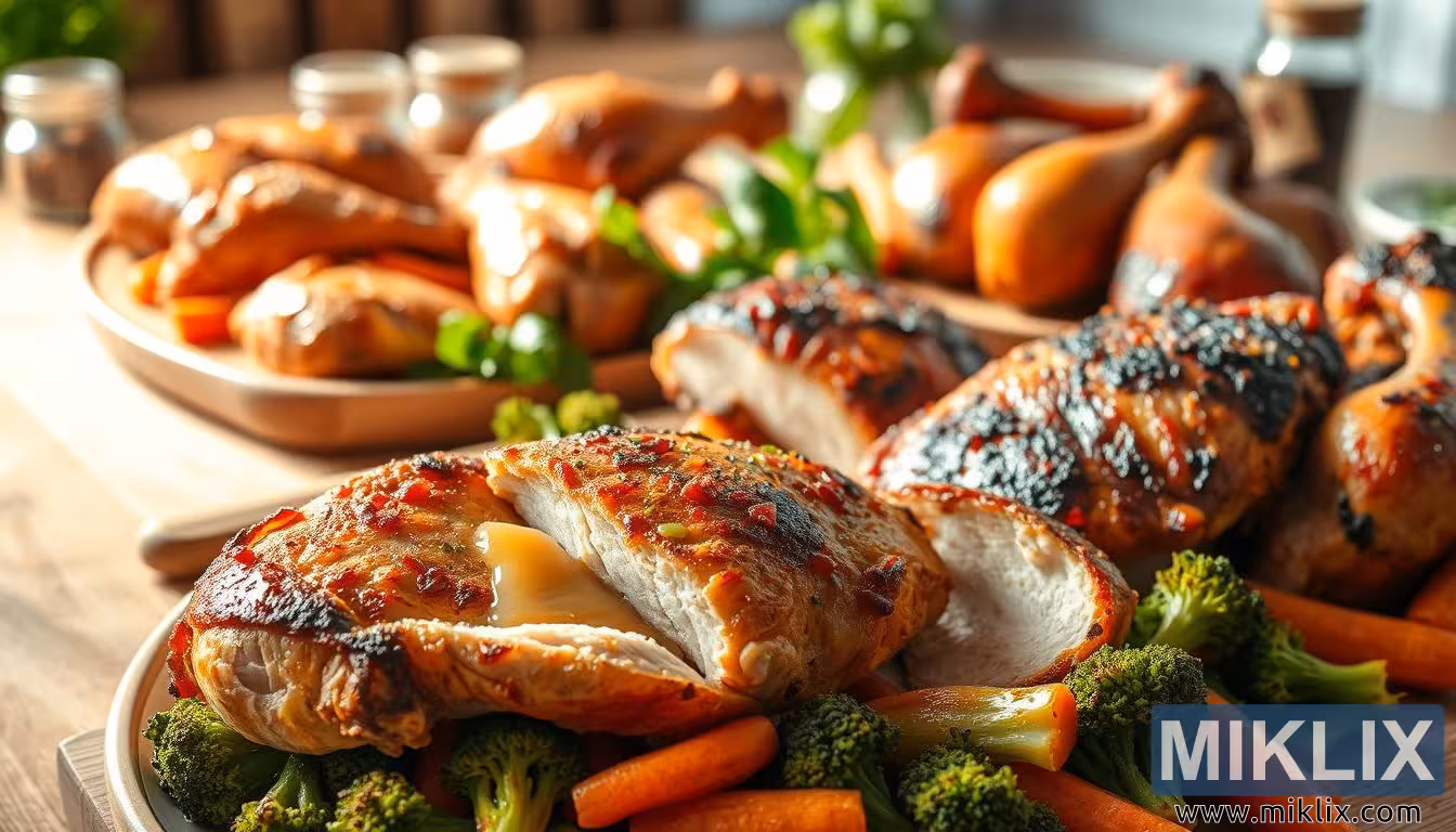 이 이미지는 즉각적인 시각적 효과 외에도 상징적인 의미를 담고 있습니다. 컴포트 푸드의 보편적인 상징인 구운 닭고기는 가족 모임, 함께하는 식사, 그리고 오랜 세월 이어져 온 전통을 떠올리게 합니다. 브로콜리와 당근 같은 건강한 반찬은 맛과 영양, 그리고 풍요로움과 웰빙의 균형을 중시하는 현대적인 감각을 반영합니다. 함께 배치된 다양한 부위의 음식은 포용성을 시사하며, 식탁에 모인 모든 사람을 위한 음식을 제공합니다. 이는 음식이 신체뿐만 아니라 공동체, 연결, 그리고 축하에도 영양을 공급한다는 것을 일깨워줍니다.