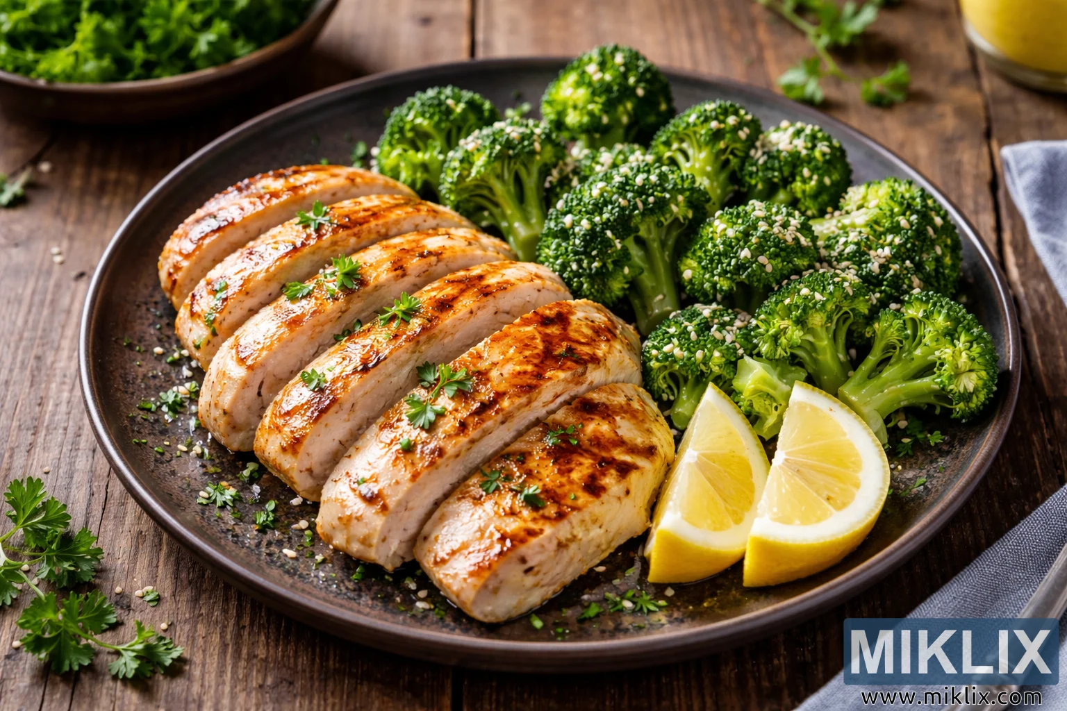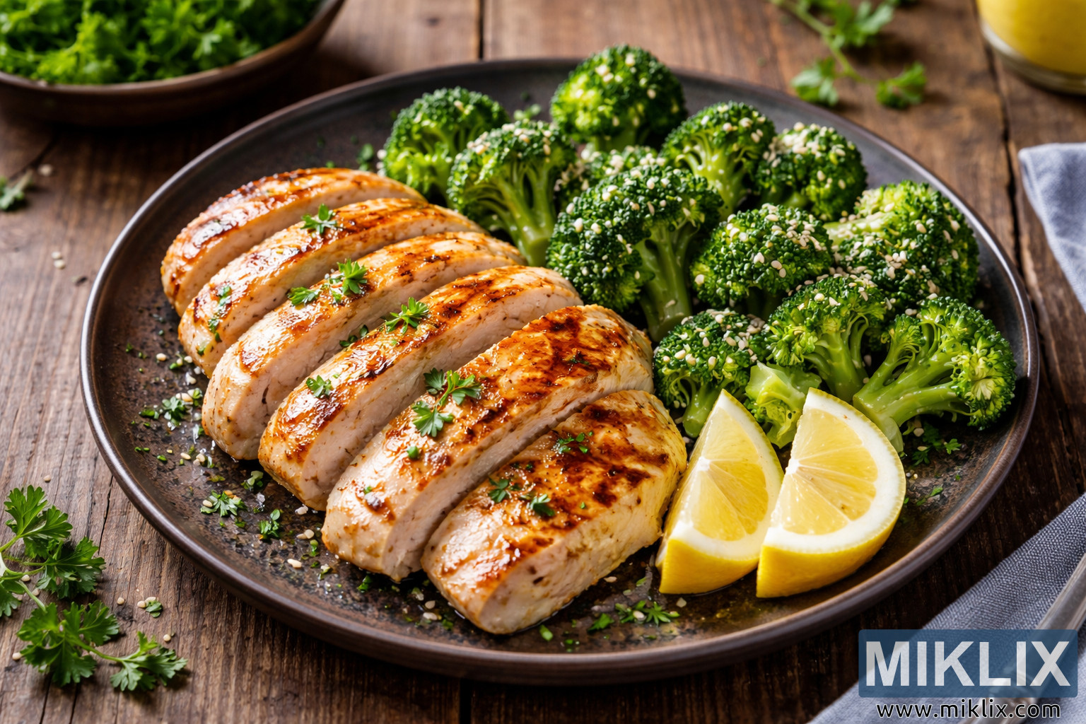구운 닭가슴살과 싱싱한 브로콜리가 소박한 나무 테이블 위에 아름답게 담겨 있는 고해상도 음식 사진입니다. 건강한 식단이나 요리 레시피에 대한 영감을 얻기에 좋습니다.