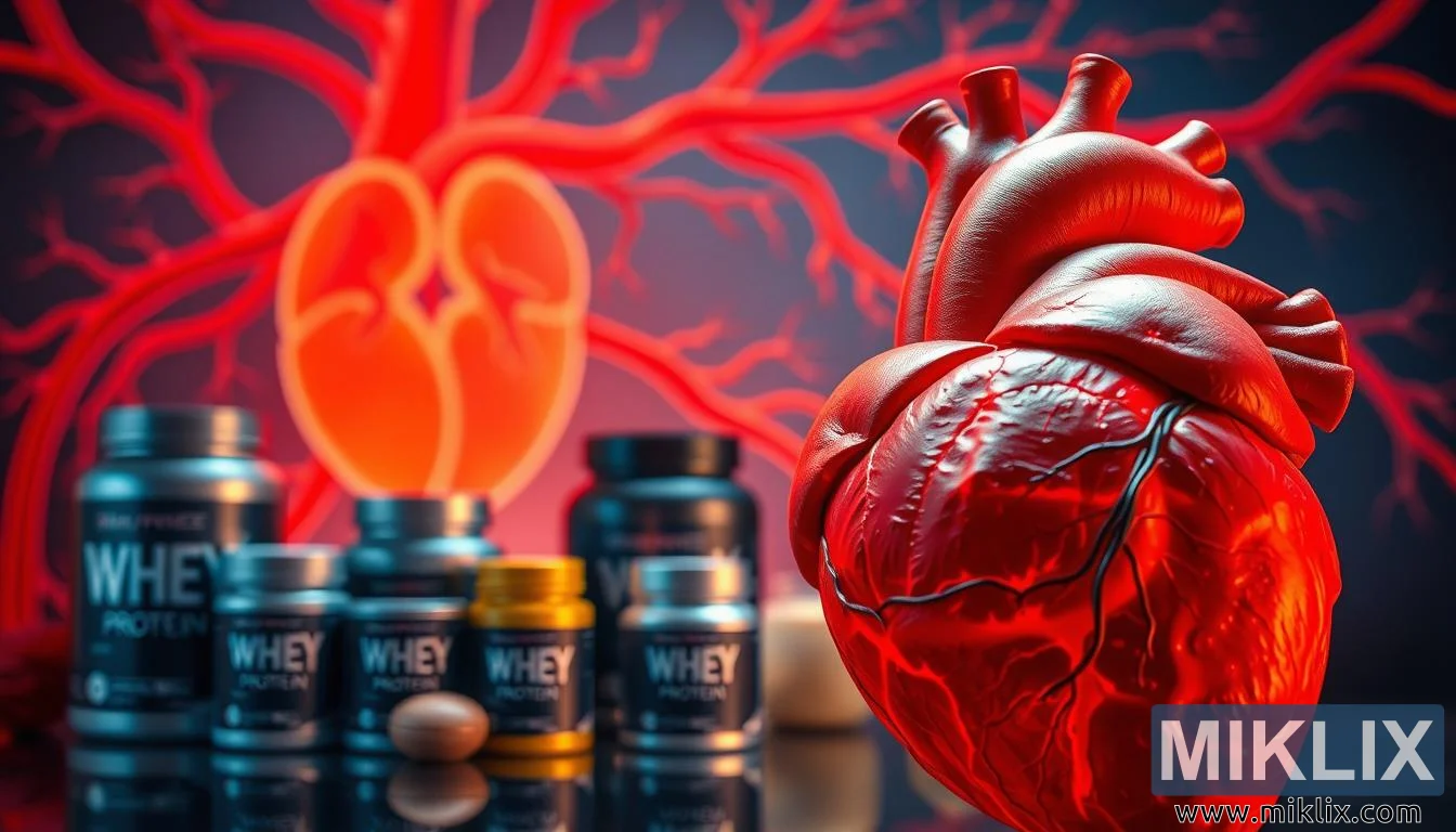 유청 단백질 보충제를 섭취한 인간의 심장을 확대한 사진으로, 심혈관 건강을 위한 유청 단백질의 활력과 순환계 이점을 강조하고 있습니다.
