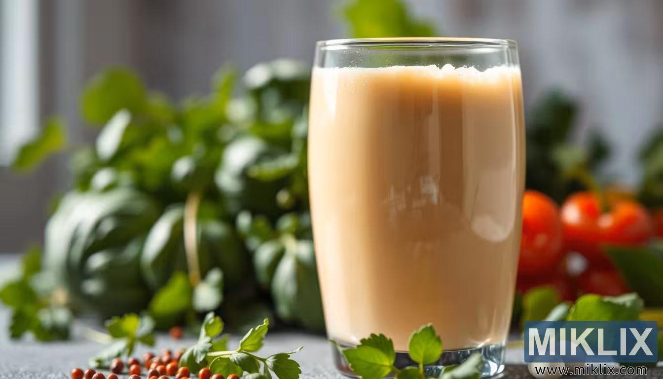 녹색 야채로 둘러싸인 부드러운 유청 단백질 쉐이크의 클로즈업으로, 건강상의 이점과 식물성 영양을 강조하고 있습니다.