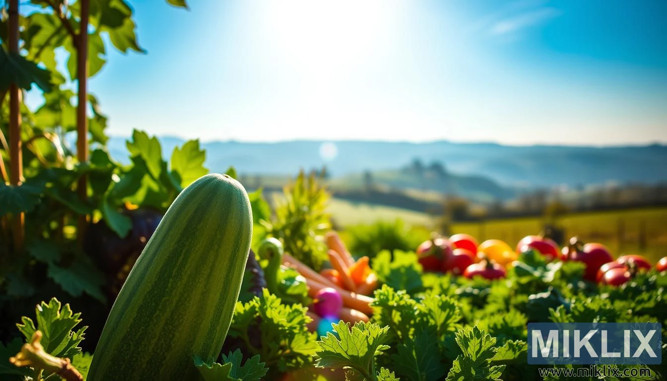 황금빛 햇살 아래 오이, 잎이 많은 채소, 당근, 토마토가 있는 푸른 정원 풍경이 시골 풍경과 어우러져 활력과 장 건강을 상징합니다.