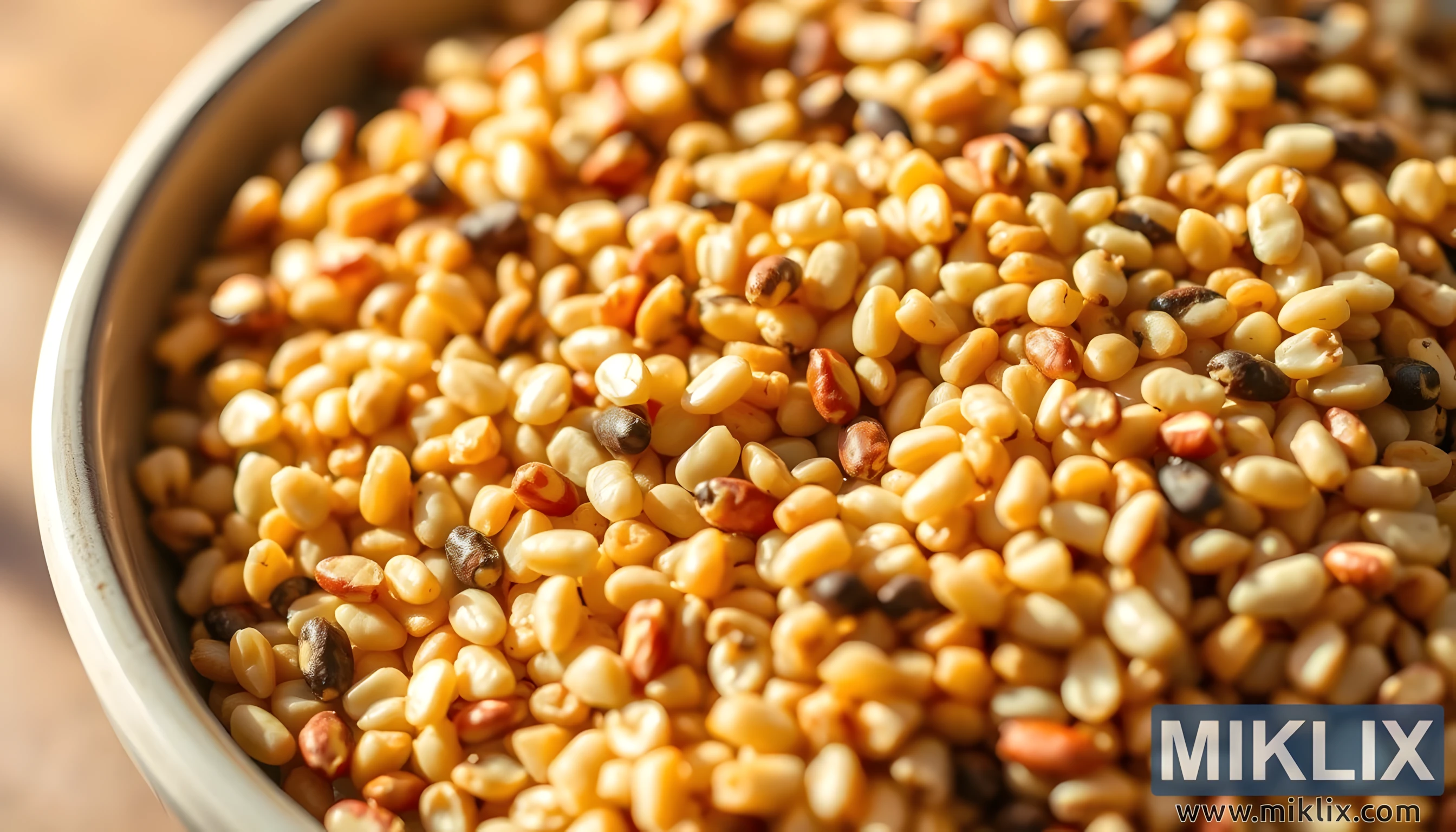 이 이미지는 풍부한 영양과 시각적 아름다움으로 오랫동안 귀하게 여겨져 온 슈퍼푸드, 퀴노아 알갱이가 가득 담긴 그릇을 클로즈업하여 보여줍니다. 언뜻 보기에 알갱이들은 은은한 황금빛부터 짙은 적갈색, 심지어 얼룩덜룩한 검은색까지 다채로운 자연색을 드러냅니다. 각 알갱이는 크기, 모양, 표면 질감의 미묘한 차이를 통해 이 건강한 음식의 진정성과 가공되지 않은 본질을 더욱 강조하며, 고유한 정체성을 지닙니다. 알갱이들은 윤이 나면서도 유기적인 느낌을 주며, 매끄러운 겉면은 따뜻하고 자연스러운 빛의 은은한 움직임을 포착하고 반사합니다. 이 조명은 그릇 표면에 은은한 황금빛을 더해, 흙빛의 풍부한 색감을 더욱 돋보이게 하고, 전체 풍경에 활력과 따뜻함을 더합니다.
