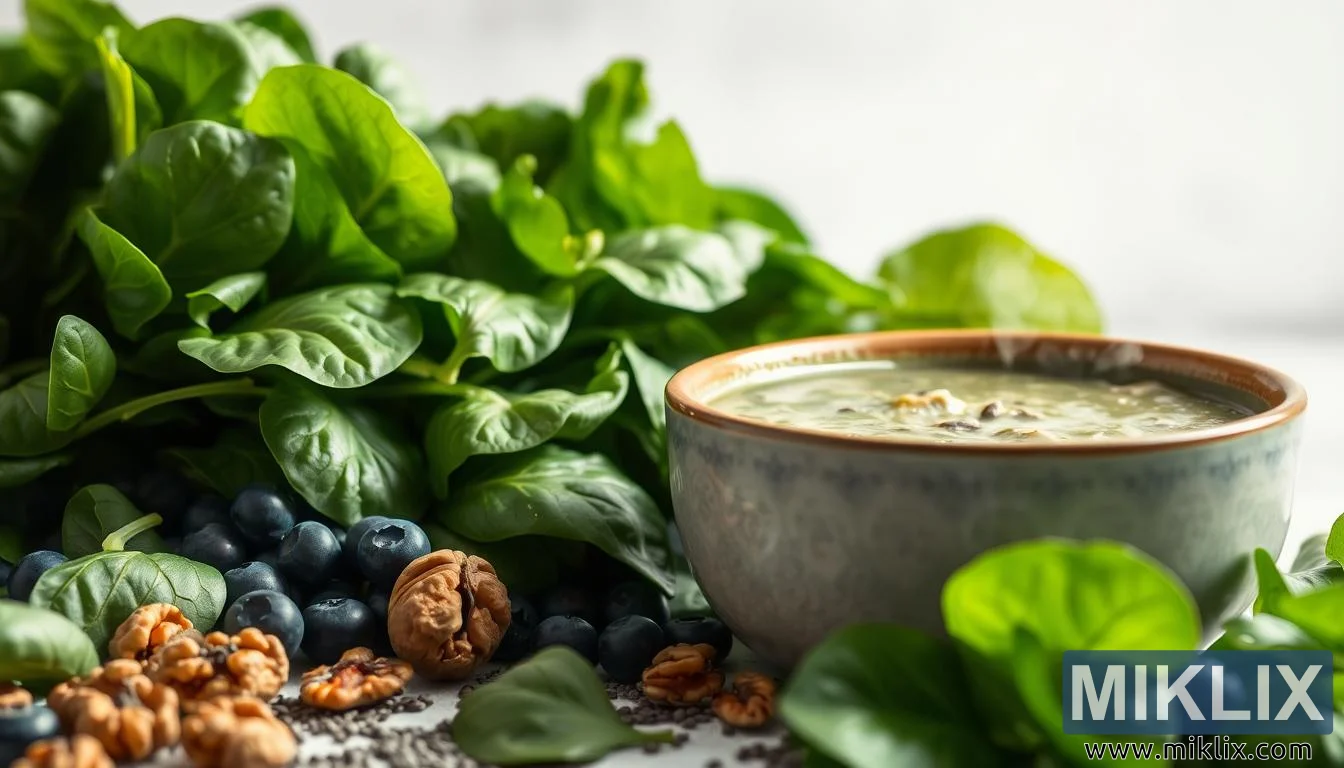 예술적 가치를 넘어, 이 이미지는 영양의 상호 연결성에 대한 더 넓은 메시지를 전달합니다. 잎채소, 항산화 성분이 풍부한 베리류, 심장 건강에 좋은 견과류, 섬유질이 풍부한 씨앗류 등 각 요소는 웰빙의 각기 다른 측면을 나타내지만, 함께 어우러져 활력이라는 전체적인 그림을 완성합니다. 시금치는 힘과 회복력을, 블루베리는 보호와 재생을, 호두는 균형과 인지를, 치아씨는 접지와 소화를 상징합니다. 수프 한 그릇은 통합의 은유가 되며, 각각의 슈퍼푸드가 합쳐져 그 이상의 무언가를 만들어냅니다.