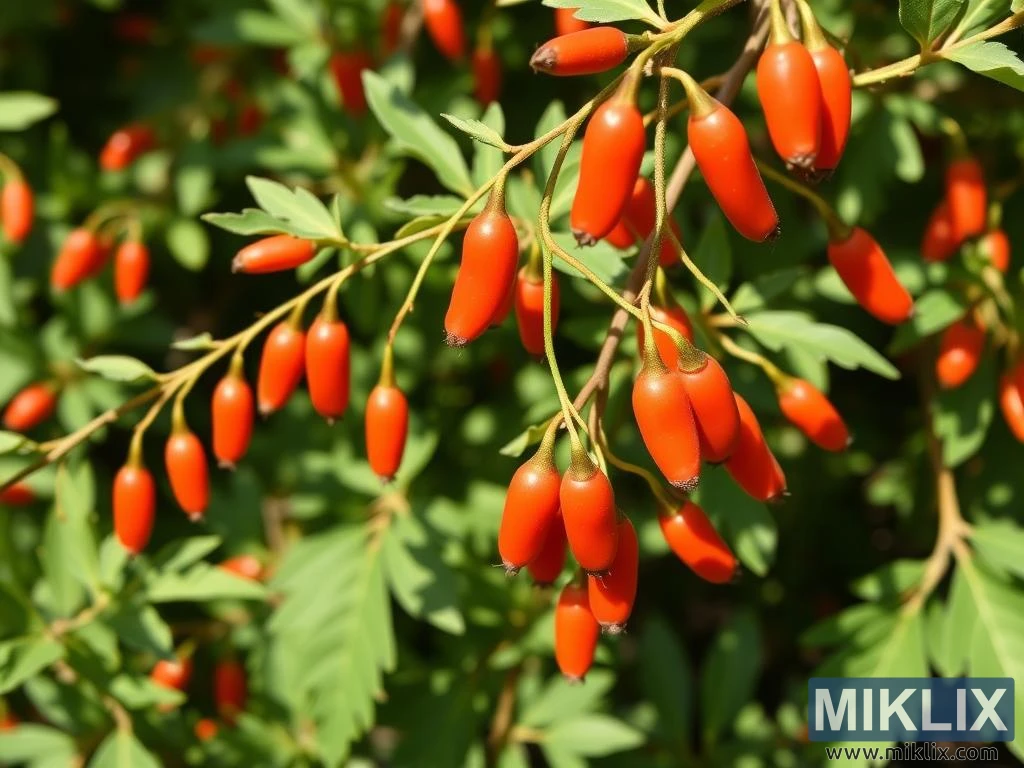 윤기 나는 붉은색 구기자 열매가 가느다란 녹색 가지에 덩어리로 매달려 있고, 싱싱한 창 모양의 잎사귀와 대조를 이루며 생생하고 건강한 풍경을 연출합니다.