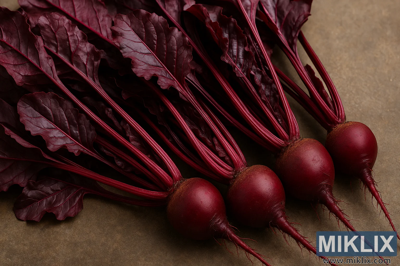 진한 보라색 붉은색 잎과 짙은 붉은색 뿌리가 소박한 배경 위에 표현된 Bull's Blood 비트의 고해상도 이미지입니다.