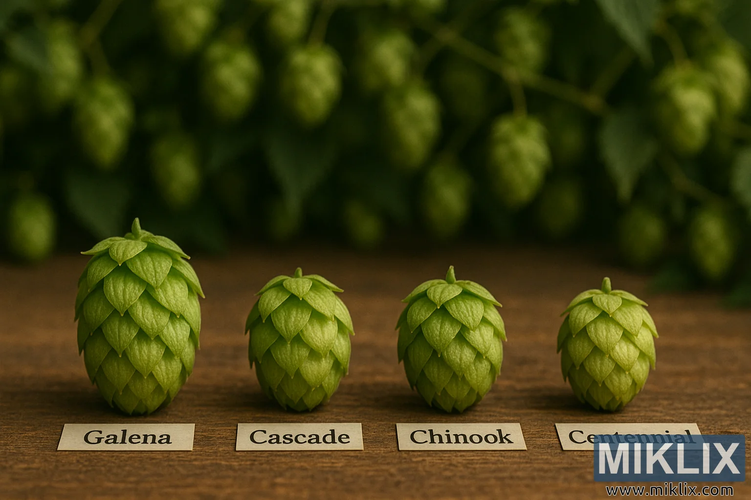 갈레나, 캐스케이드, 치누크, 센테니얼 홉을 전시한 소박한 테이블로, 각 홉의 독특한 색상, 질감, 양조 품질을 강조하고 있습니다.