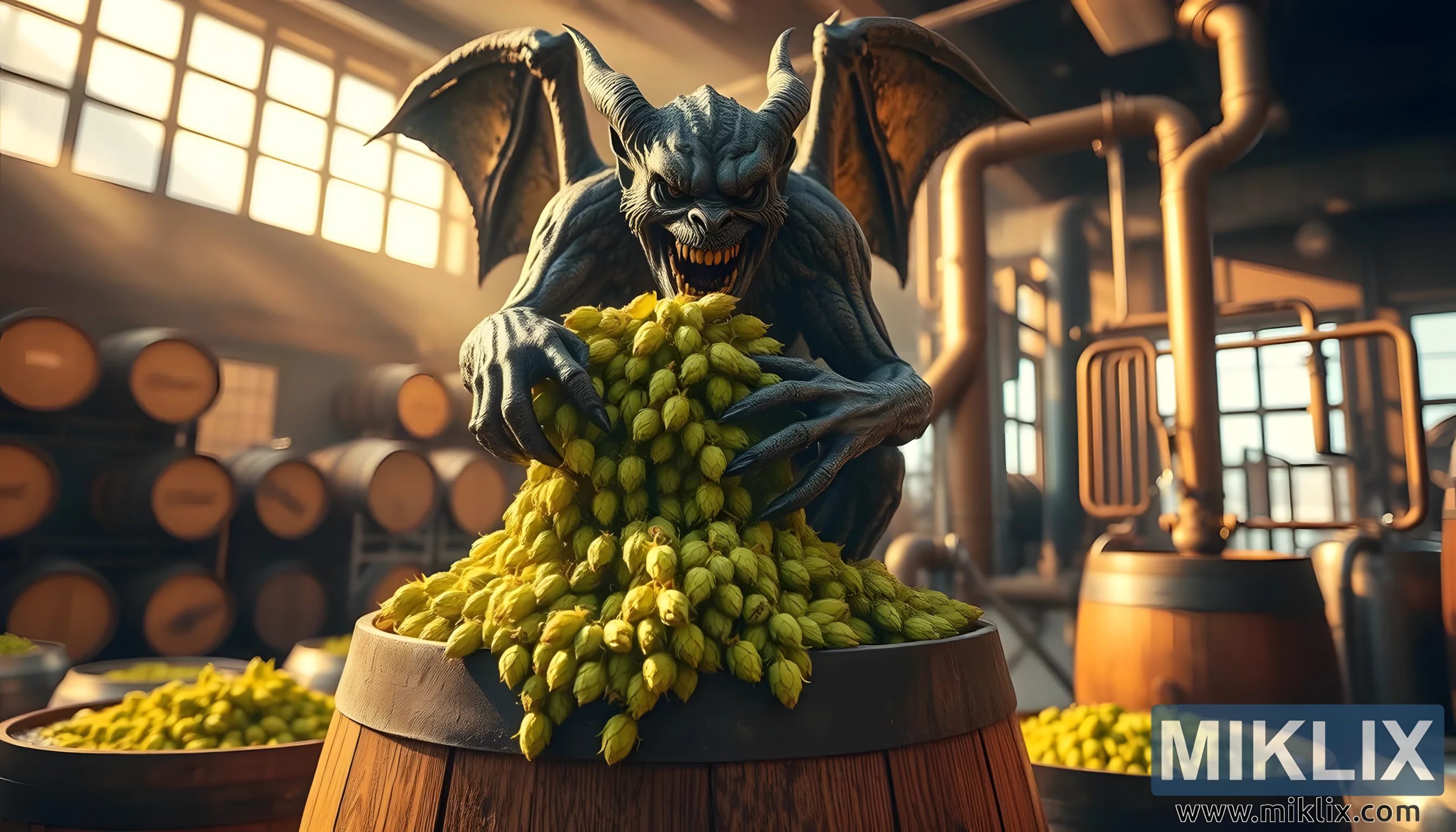 이 이미지는 북적이는 양조장 벽 안에서 펼쳐지는 강렬하고 초현실적인 광경을 보여주며, 신화와 장인 정신의 세계를 하나의 잊을 수 없는 장면으로 융합합니다. 작품의 중심에는 위협적이면서도 위엄 있는 형상의 가고일이 신선한 홉이 가득 담긴 커다란 나무통 위에 웅크리고 있습니다. 깊은 홈과 능선이 새겨진 돌처럼 회색빛의 몸통은 마치 살아있는 듯 생생하게 느껴지며, 높은 창문을 통해 쏟아지는 황금빛은 그 생물의 날카롭고 뾰족한 이목구비를 비춥니다. 어둡고 가죽 같은 돛처럼 뒤로 펼쳐진 날개는 빛을 받아 무겁고 불길한 분위기를 자아냅니다. 가고일의 얼굴은 이빨을 드러내며 일그러져 있는데, 장난기와 위협이 뒤섞인 표정입니다. 길고 발톱이 달린 손이 그 아래 쌓인 홉 더미를 탐욕스럽게 움켜쥐고 있습니다. 녹색 원뿔이 풍부하게 쏟아져 내려 통의 측면으로 넘쳐흐르는 푸른 생명의 홍수는 가고일의 거칠고 침울한 형태와 극명한 대조를 이룹니다.