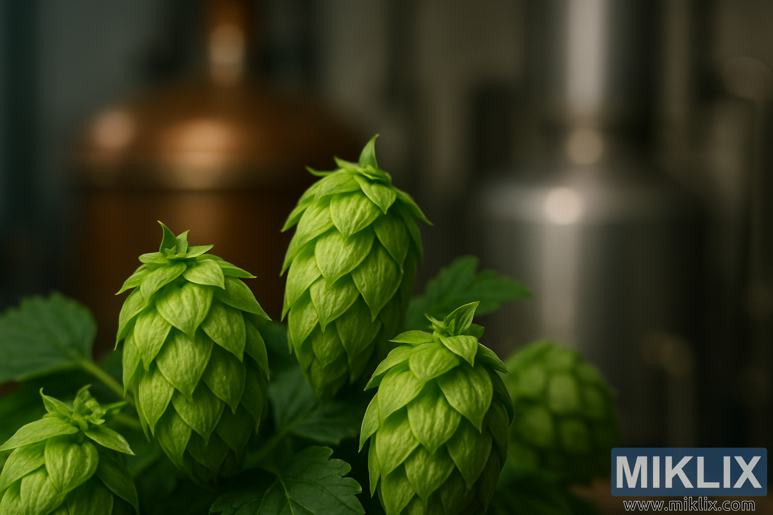 신선한 글레이셔 홉 콘은 자연광에서 빛나고, 수지 질감은 흐릿한 양조 도구에 대비되어 더욱 돋보이며, 수제 드라이 홉핑에서의 역할을 보여줍니다.