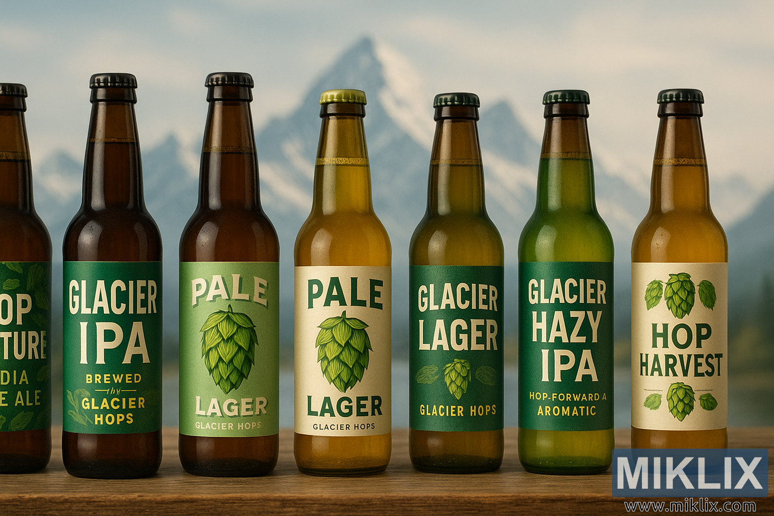 병의 라인업은 다양성과 장인정신을 즉각적으로 느끼게 합니다. 라벨은 깔끔하고 다채로우며 홉을 중심으로 디자인되었으며, 많은 병에 홉 콘의 양식화된 일러스트가 중심 모티프로 적용되었습니다. 각 디자인은 신선함, 향, 그리고 개성을 강조하는데, "글레이셔 IPA", "페일 라거", "글레이셔 라거", "글레이셔 헤이지 IPA", "홉 하비스트"와 같은 이름은 글레이셔 홉에 대한 의존성과 그것이 강화할 수 있는 스타일의 다양성을 명확하게 보여줍니다. 굵으면서도 깔끔한 타이포그래피는 친근하면서도 자신감을 표현하며, 녹색, 흰색, 그리고 흙빛 톤의 사용은 디자인을 재료 자체와 연결시킵니다. 이러한 시각적 선택은 글레이셔 홉이 단순한 첨가물이 아니라 각 맥주의 특징이며 맛과 브랜딩을 형성한다는 생각을 강화합니다. 직선으로 배열된 병들은 마치 양조업자가 다양한 레시피를 고려하거나 소비자가 어떤 스타일을 먼저 시도할지 고민하는 것처럼 보는 사람이 나란히 비교하도록 합니다.