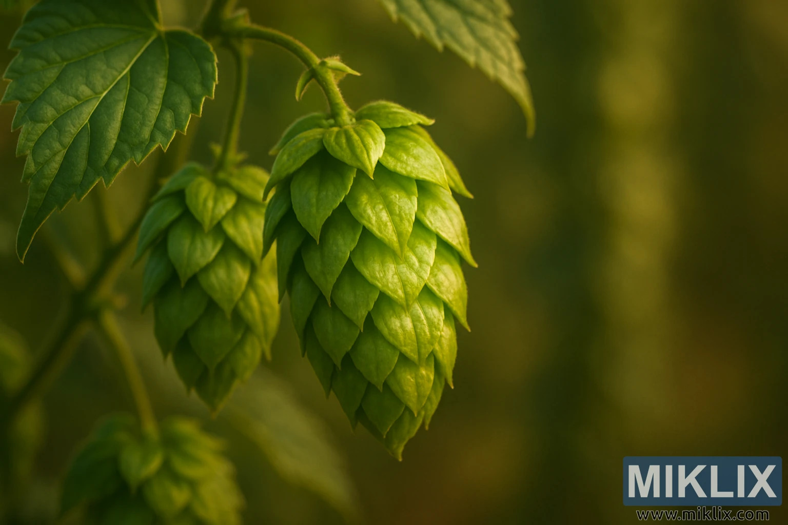 이중 목적의 홉 콘을 클로즈업으로 찍은 사진입니다. 복잡한 녹색 포엽이 황금빛으로 빛나고, 덩굴과 잎이 부드럽게 초점을 맞춘 배경에 어우러져 있습니다.