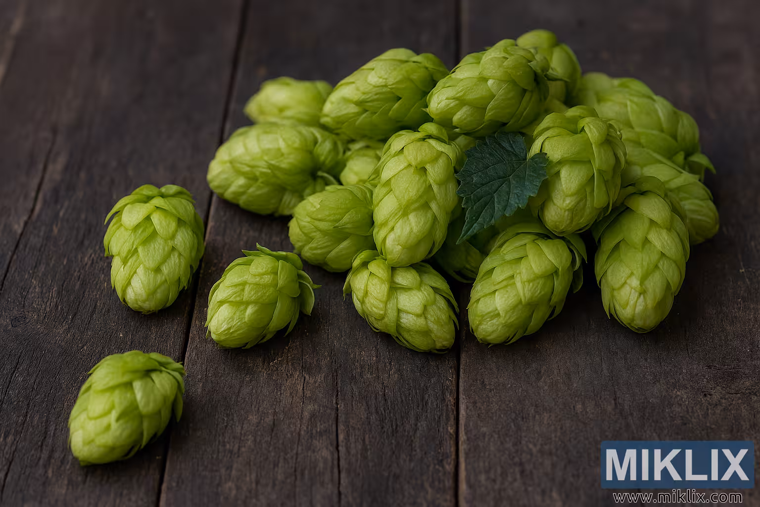 고해상도의 풍경 사진에는 갓 수확한 서던 브루어 홉 콘들이 소박한 나무 테이블 위에 놓여 있는 모습이 담겨 있습니다. 홉 콘들은 프레임 오른쪽으로 듬성듬성 쌓여 있고, 왼쪽에는 여러 개의 개별 콘들이 흩어져 있어 자연스러운 움직임과 풍부함을 자아냅니다. 각 콘은 옅은 황록색부터 진한 에메랄드빛까지 선명한 녹색을 띠며, 솔방울과 같은 구조를 이루는 포엽이 특징적으로 겹쳐 보입니다. 포엽은 촘촘하게 뭉쳐 있으며, 미묘한 맥과 약간 반투명한 질감 덕분에 빛이 투과되어 질감과 사실감을 더합니다.