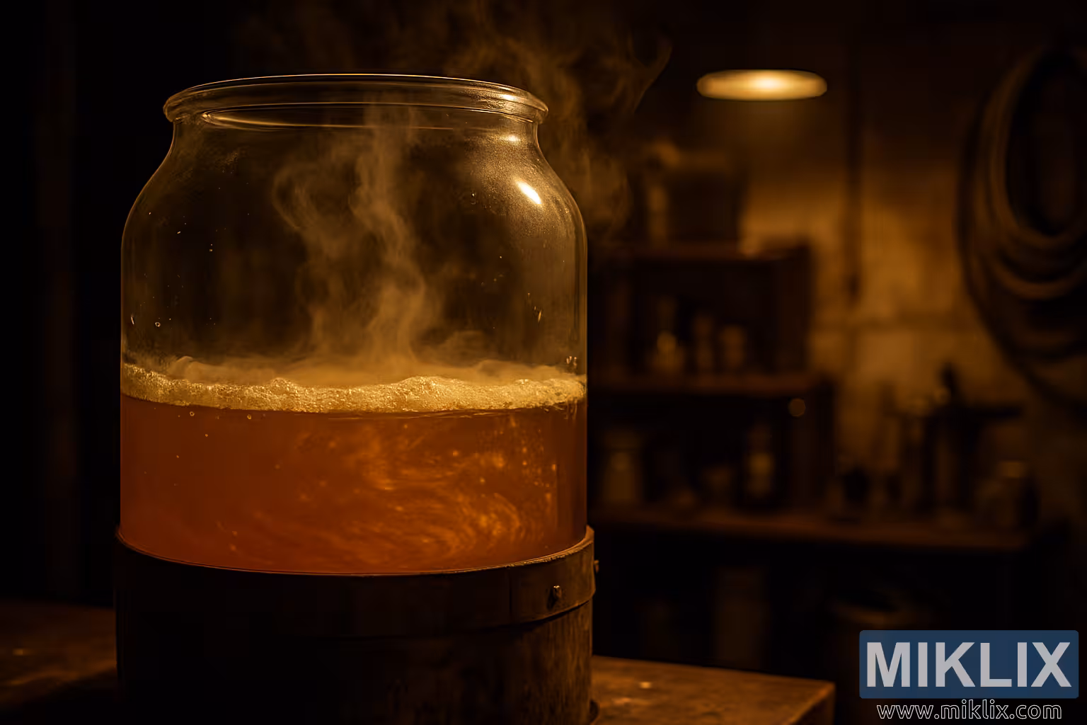 따뜻하게 밝혀진 유리 발효 탱크 안에서 소용돌이치는 호박색 액체와 증기가 있는, 소박하지만 오래된 홈브루잉 작업장입니다.