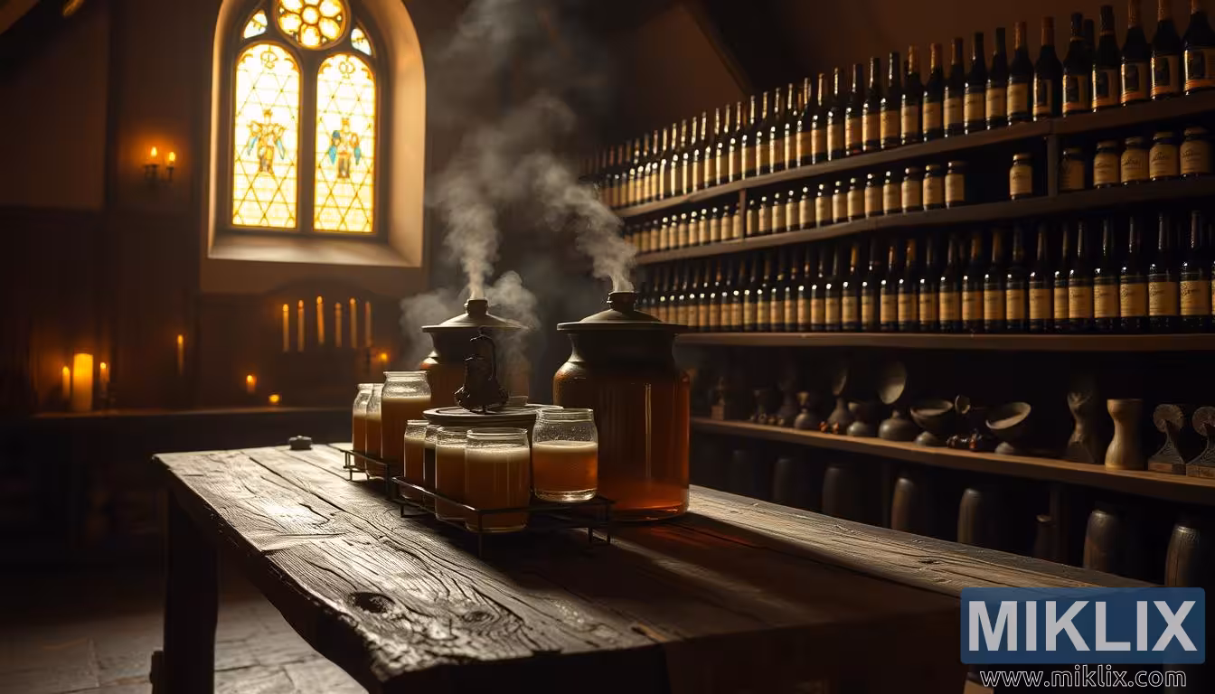 촛불이 켜진 수도원 안에서 김이 모락모락 나는 용기와 늘어선 오래된 병들은 수도원의 신성한 양조 기술을 보여줍니다. 인내와 헌신이 겸손한 재료를 액체 예술로 변모시킵니다.
