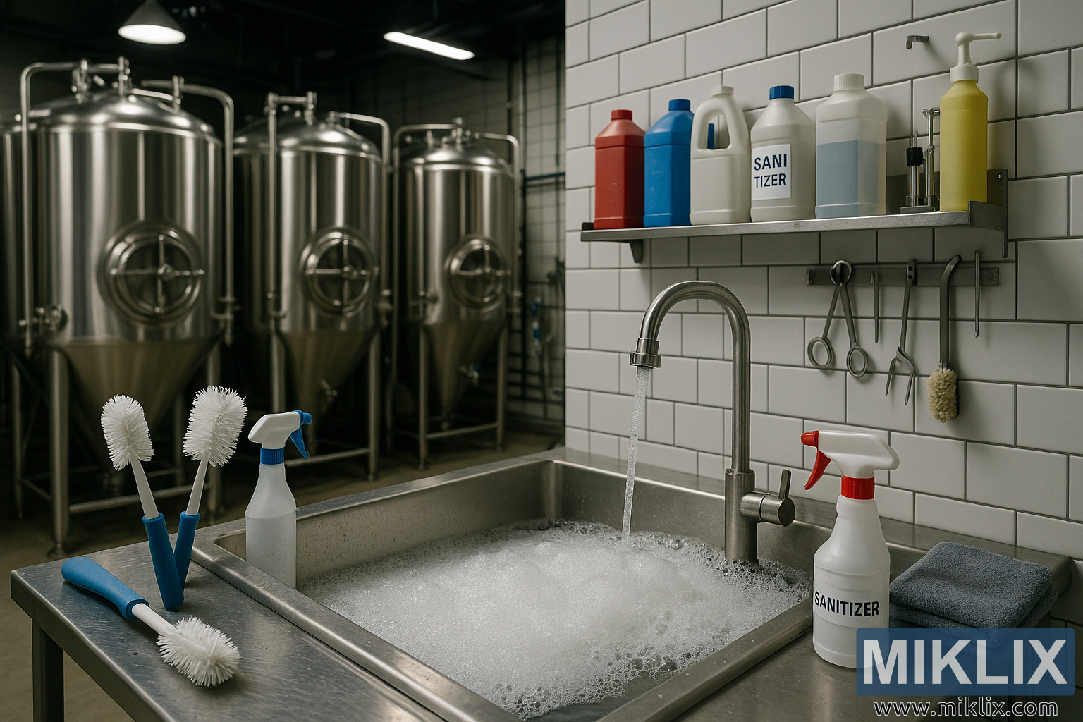 사진의 구도는 전경의 바로 앞에 있는 세척 작업대에서, 가운데의 티끌 하나 없이 깨끗한 탱크들을 지나, 배경의 잘 갖춰진 위생 선반으로 시선을 사로잡습니다. 전체 장면은 임상적 청결함과 엄격한 절차를 보여주며, 미생물 활동, 특히 킬러 효모 균주와 관련된 모든 환경에서 적절한 위생 관리가 무엇보다 중요하다는 원칙을 구현합니다. 밝은 조명, 반사 표면, 그리고 세심하게 정리된 장비들이 어우러져 맥주 제조 또는 발효 과정에서 전문성, 정밀성, 그리고 안전과 위생에 대한 확고한 의지를 시각적으로 보여줍니다.