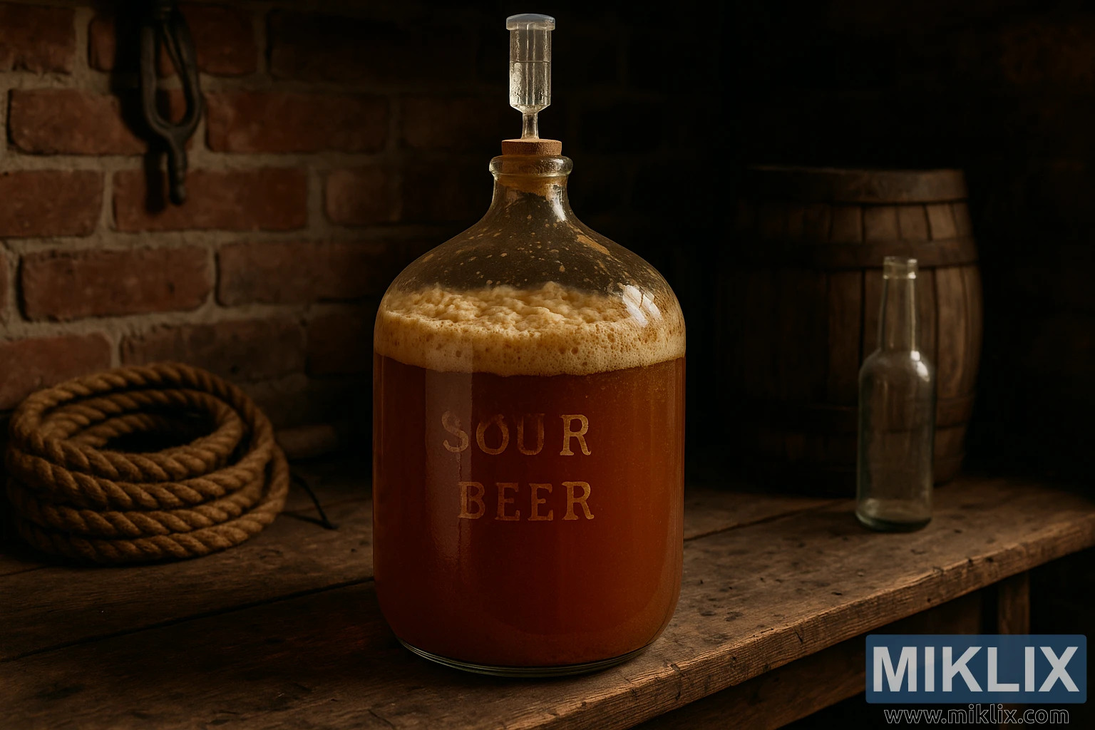 유리 카보이에서 발효 중인 사워 맥주를 클로즈업으로 찍은 사진입니다. 주변에는 빈티지 양조 도구와 나무 통이 있고, 전통적인 가정 양조를 연상시키는 따뜻하고 소박한 분위기가 있습니다.