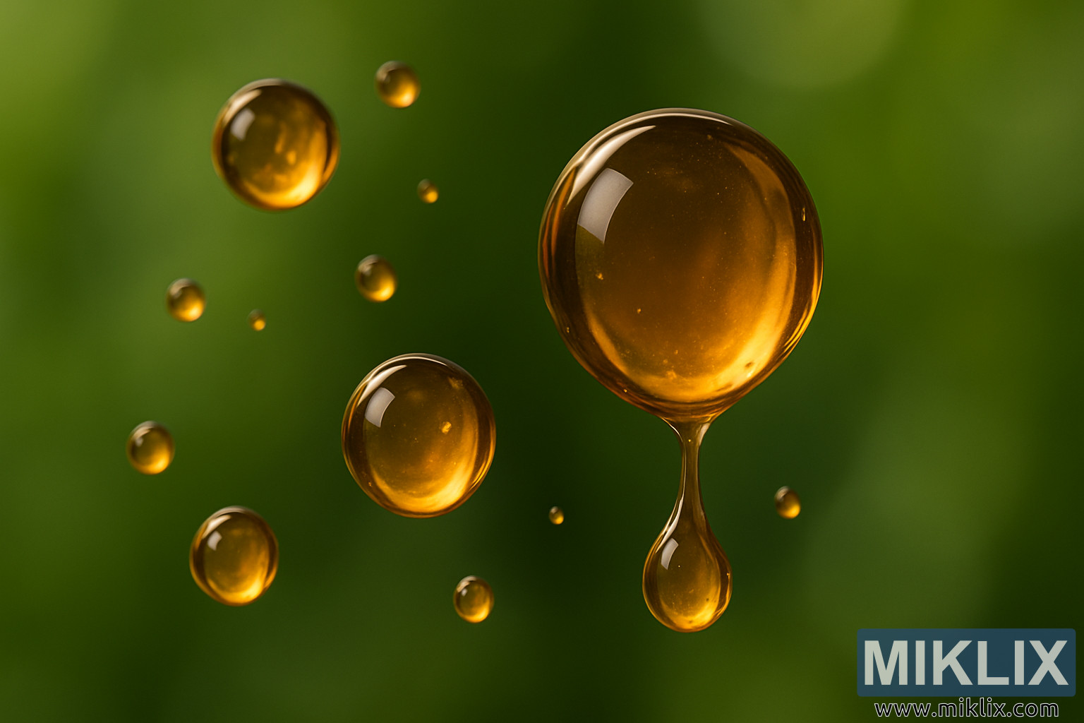 Paveikslėlyje pateikiamas ryškus makrofotografija, kurioje matyti iš „Mount Hood“ apynių veislės gautų eterinio aliejaus lašeliai, pakibę minkštame, neryškiame žalių lapų fone. Iš pirmo žvilgsnio lašeliai atrodo kaip mažyčiai gintaro spalvos brangakmeniai, švytintys šiluma ir sodrumu, atspindėdami aplinkos apšvietimą. Jų permatomas, aukso rudos spalvos atspalvis primena sudėtingą aromatą ir cheminį gylį, kurį apynių aliejai suteikia alui – aštrų, žemišką, gėlių ir dervų aromatą vienu metu.