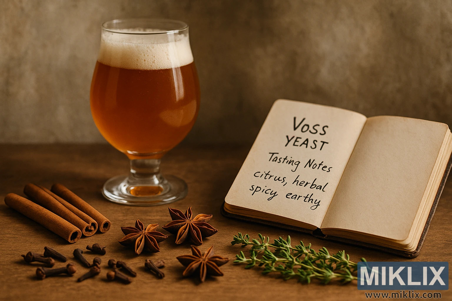 Šiltas, kaimiškas natiurmortas, vaizduojantis Voss mielių juslines natas, su gintaro spalvos alumi, ranka rašytais degustacijos užrašais ir aromatinių prieskonių bei žolelių asortimentu, apšviestu švelnia natūralia šviesa.