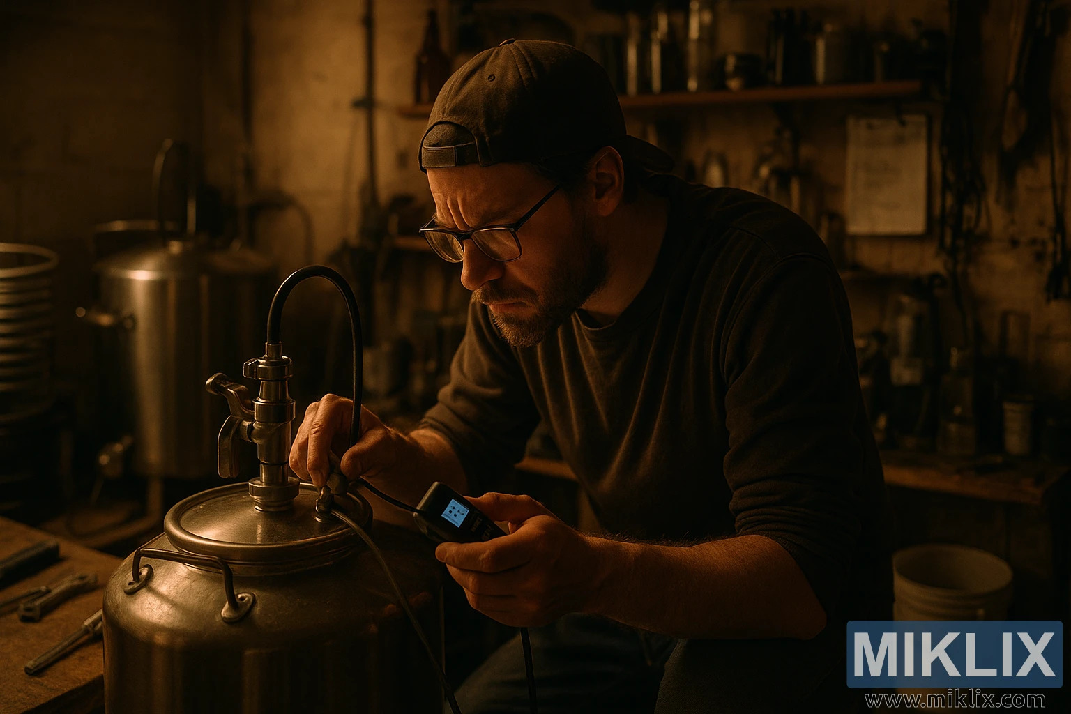 Focused Brewer Troubleshooting Voss Yeast Fermentation in a Warmly Lit Home Brewery