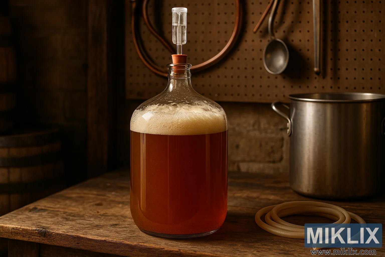 Paveikslėlyje pavaizduota kaimiška naminio alaus darymo scena, kurios centre – didelis stiklinis butelis, dominuojantis kompozicijoje. Šis butelis, pagamintas iš storo, skaidraus stiklo, pripildytas gintaro spalvos skysčio – bavariško stiliaus lagerio, kuris pats yra fermentacijos proceso įkarštyje. Skystis viduje spinduliuoja šiltą, aukso rudos spalvos atspalvį, o subtilūs spalvų perėjimai gilėja link dugno, rodydami alaus tirštumą ir sodrumą. Ant viršaus guli putojantis, šiek tiek nelygus krausen alus, kurio kreminiai balkšvi burbuliukai prilimpa prie viršutinių indo kraštų – tai matomas aktyvios fermentacijos ženklas. Iš siauro butelio kaklelio kyla guminis kamštis, tvirtai uždarantis angą, o į viršų kyla klasikinė vandeniu užpildyta oro šliuzo anga. Paprastas ir funkcionalus oro šliuzas silpnai žiba aplinkos apšvietime ir yra ir praktiškas įrankis, ir amžinos kantrybės, reikalingos alaus darymui, simbolis.