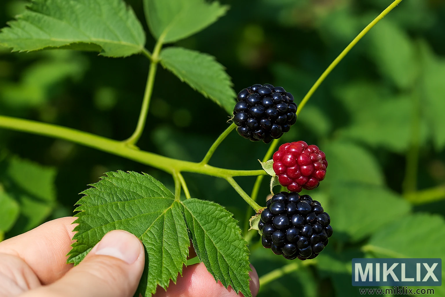 Priekiniame plane išryškėja kelios prinokusios gervuogės, įvairiose brandos stadijose. Kai kurios uogos yra tamsiai juodos ir blizgios, rodančios maksimalų prinokimą, o kitos yra raudonos ir šiek tiek permatomos, o tai rodo, kad jos vis dar vystosi. Šios uogos susitelkusios palei lygius stiebus, kurie švelniai išlinksta ir yra paremti ryškiai žaliais lapais su dantytais kraštais ir ryškiomis gyslomis. Lapai vešlūs ir sveiki, suteikiantys vaizdui tekstūros ir gylio.