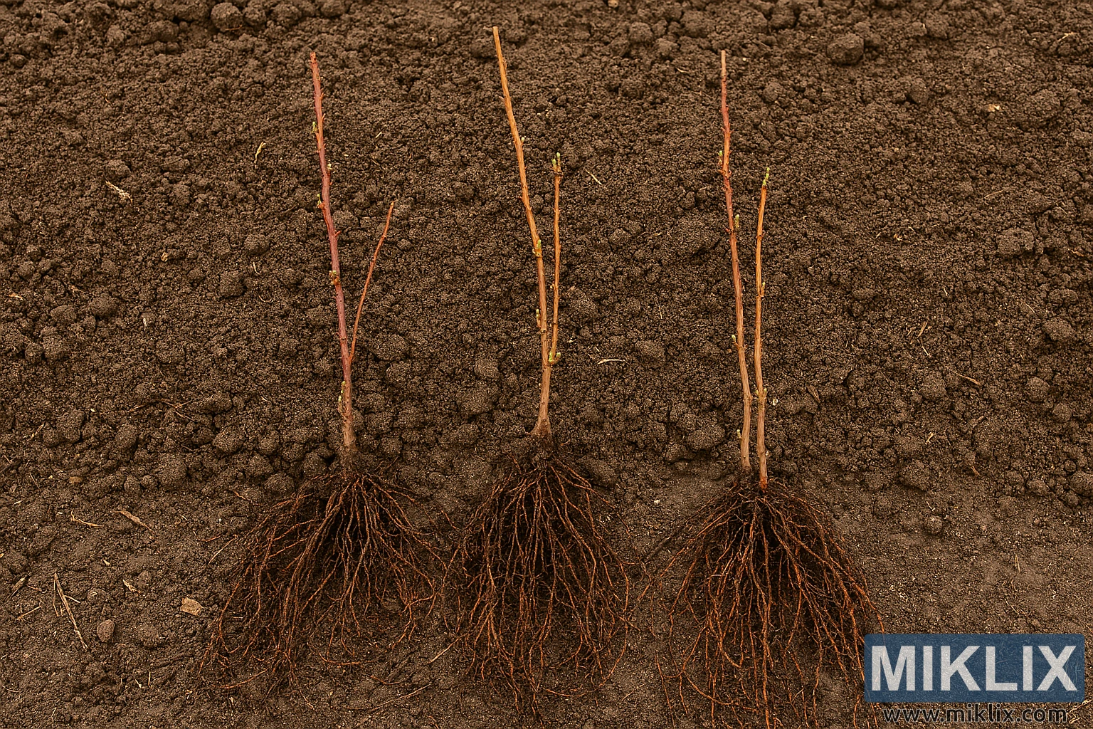Šiame didelės raiškos kraštovaizdžio paveikslėlyje užfiksuoti trys plikšakniai gervuogių augalai, kruopščiai išdėstyti šviežiai įdirbtoje dirvoje, paruošti sodinimui. Nuotrauka daryta iš viršaus į apačią, todėl aiškiai ir detaliai matyti augalų atviros šaknų sistemos ir ploni stiebai. Kiekvienas augalas išdėstytas vertikaliai, jo pluoštinės šaknys išsibarsčiusios tamsioje, purioje žemėje. Šaknys yra sodraus rudo atspalvio, susivėlusios ir drėgnos, su smulkiomis, plaukus primenančiomis sruogomis, susipynusiomis su storesnėmis, tvirtesnėmis šaknimis. Prie šaknų prilimpa maži dirvožemio gumulai, pabrėžiantys jų pasirengimą persodinti.