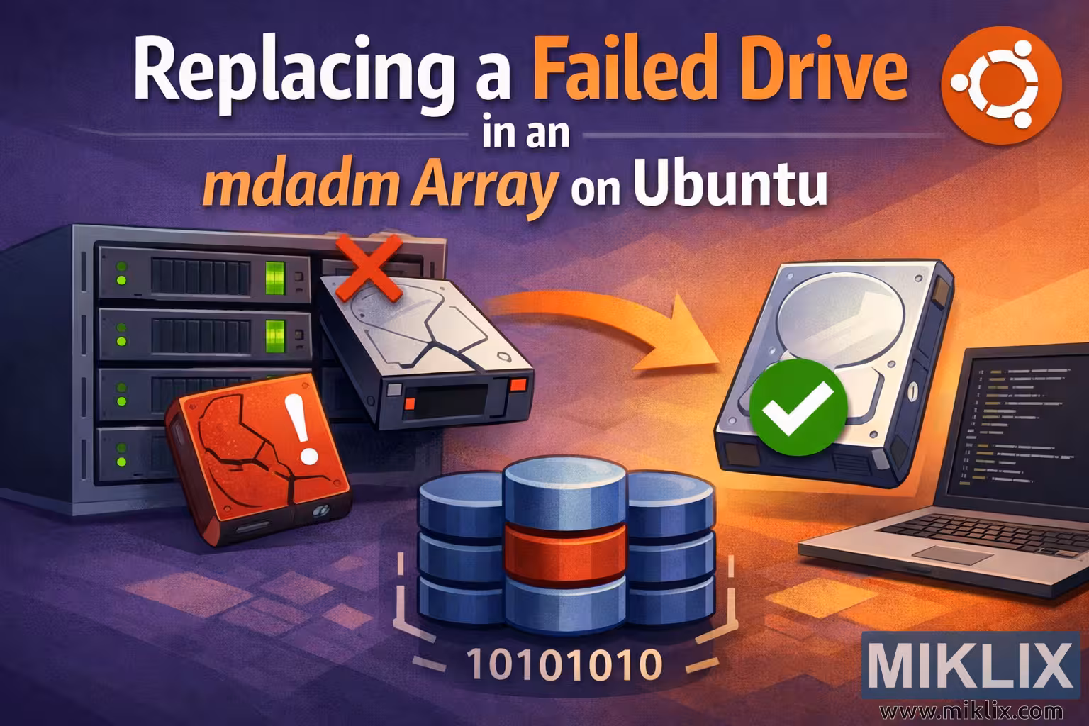 Reklaminės juostos iliustracija tinklaraščio įrašui apie sugedusio disko pakeitimą mdadm RAID masyve Ubuntu sistemoje, naudojant aiškias piktogramas, rodančias gedimą ir atkūrimą.