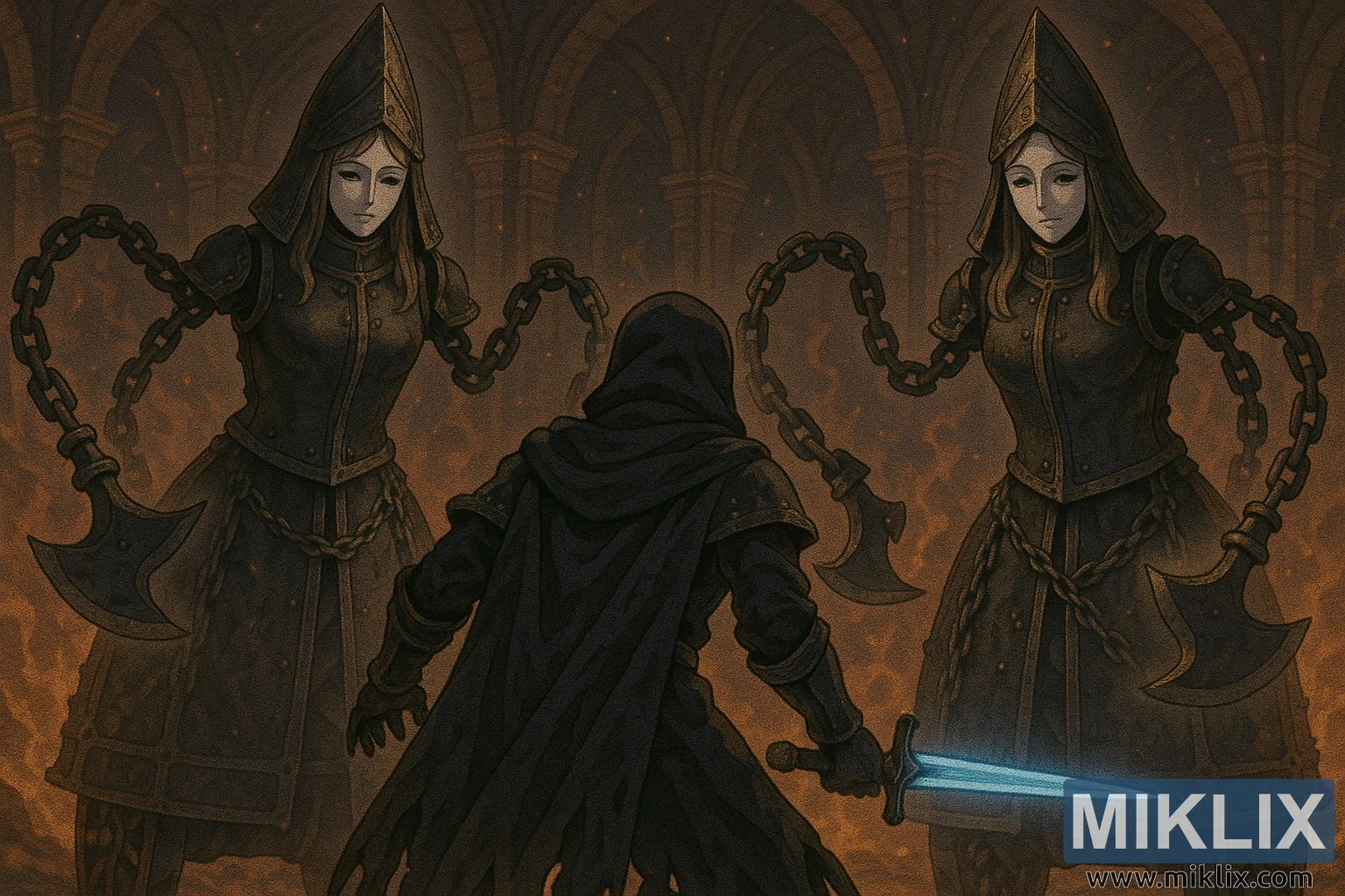 Anime stiliaus piešinys, vaizduojantis Juodojo Peilio karį, susiduriantį su dviem Pagrobėjų Mergelėmis Eldeno Žiede, vaizduojamas kaip šarvuotos geležinės mergelės ant ratų su grandininiais kirviais ugningoje menėje.