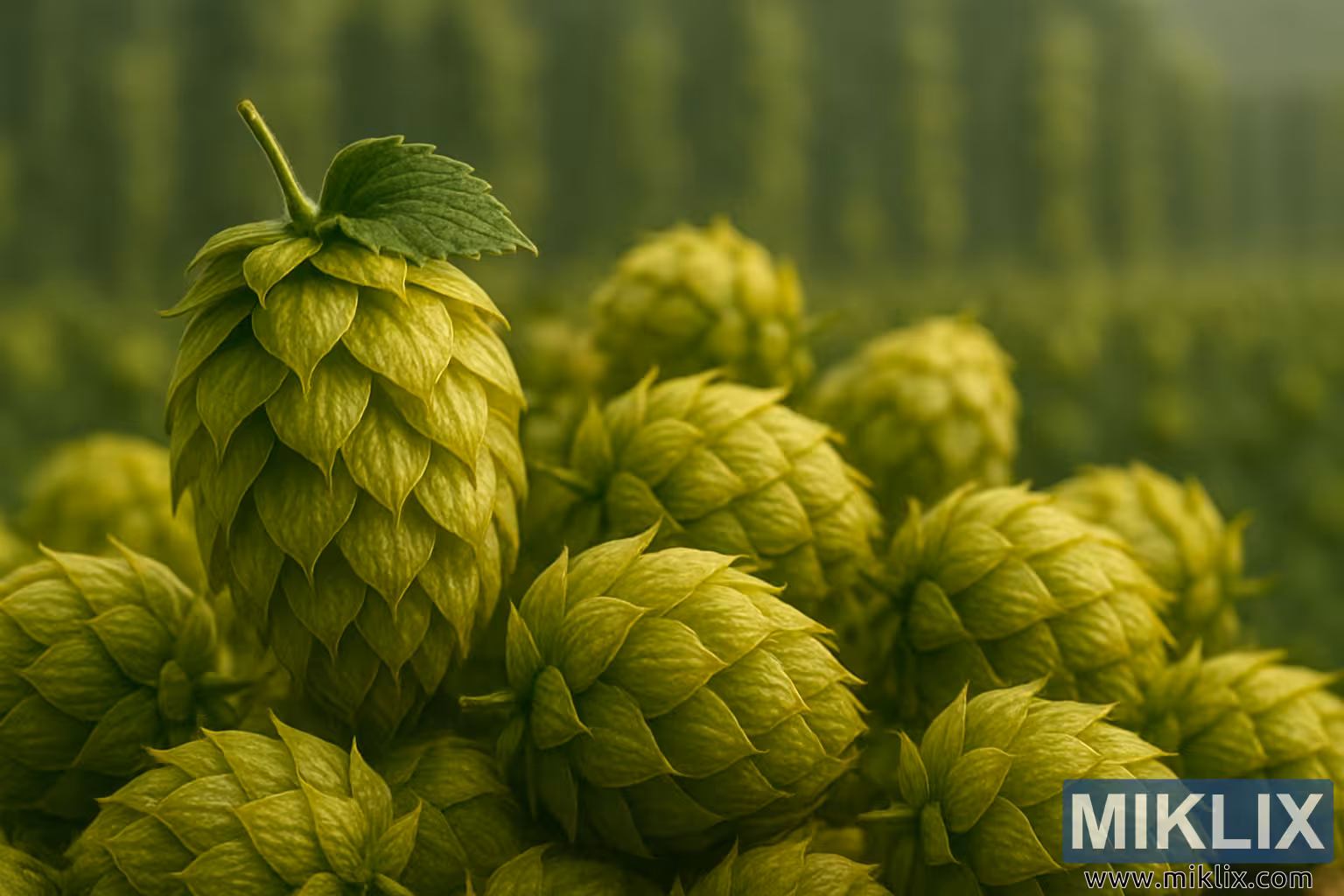Centrā viens čiekurs paceļas nedaudz virs pārējiem, tā kāts un viena lapa joprojām ir piestiprināti, gandrīz kā vainags stāvot ražas augšpusē. Šis vientuļais apiņu čiekurs kļūst par centrālo punktu, kas simbolizē šķirnes mantojumu un tās ilgstošo nozīmi alus darīšanas pasaulē. Aiz šī ķekara tālumā stiepjas izplūdušas apiņu lauka kontūras, vertikālās režģotu rogas atgādina par plašāku kontekstu, no kura šie rogas tika savākti. Miglaini zaļais plašums fonā pastiprina iespaidu, ka šī mazā apiņu kaudze ir tikai daļa no daudz lielākas ražas, kas ir vairāku mēnešu pacietīgas kultivēšanas kulminācija zem Austrālijas saules.