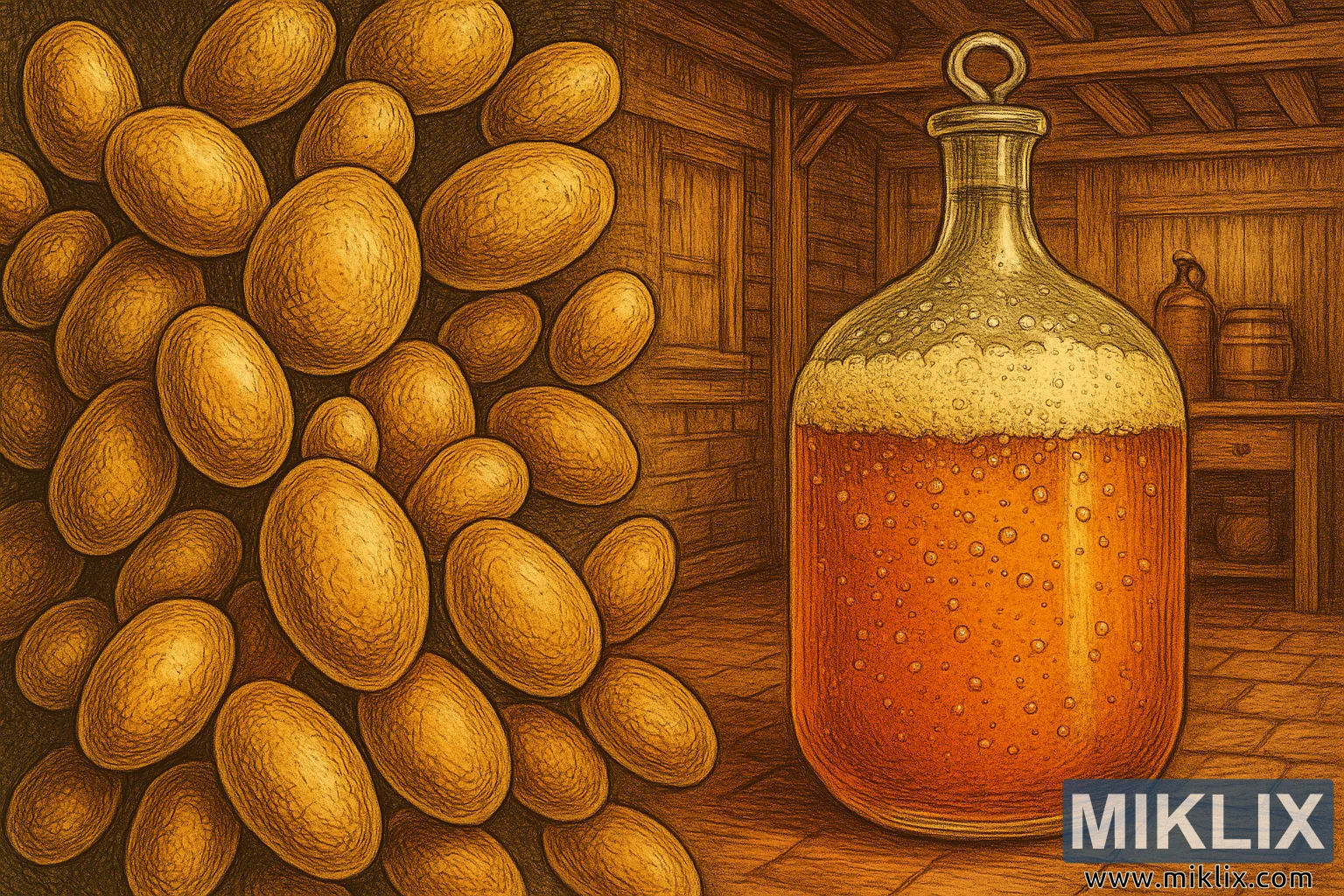 Pārejot uz vidusceļu, kompozīciju notur liels, vintage stila stikla trauks. Tā noapaļotā forma ir piepildīta ar mirdzošu dzintara krāsas šķidrumu – pašu Saison alu. Trauka virsma ir veidota ar rūpīgiem akcentiem, kas liecina par izliekumu un caurspīdīgumu, savukārt šķidrums iekšpusē mutuļo ar burbuļiem, kas paceļas pretī putojošai, gaišai galvai. Šī vizuālā detaļa atspoguļo fermentācijas dzīvīgumu, rauga darbību un alus atdzīvošanos traukā. Klasiskās stikla formas izvēle ar izturīgu cilpu kakliņā novieto fermentācijas procesu gan funkcionālā, gan vēsturiski autentiskā kontekstā, atspoguļojot tradicionālās alus darīšanas rīkus.