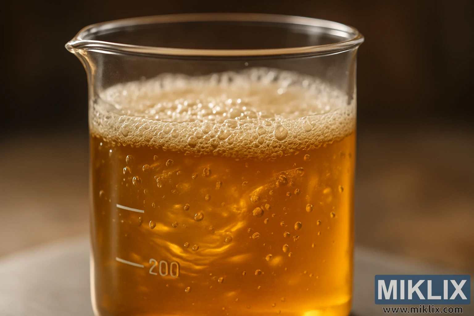Šajā valdzinošajā tuvplānā skatītājs tiek ierauts alus darīšanas eksperimenta sirdī, kur zinātne un amatniecība saplūst vienā traukā. Kompozīcijas centrālais elements ir caurspīdīga laboratorijas vārglāze, kas apzīmēta ar precīzām baltām kalibrēšanas līnijām. 200 mililitru atzīme ir labi redzama, noenkurojot ainu izmērītas precizitātes un kontrolētas transformācijas kontekstā. Vārglāzē zeltaini brūns šķidrums virpuļo dzīvības pilns, tā dzidrums un nokrāsa atgādina saules apspīdētu dzintaru vai pirmo tikko brūvēta gaišā alus kausu. Šķidrums nav statisks — tas pulsē kustībā, ko iedvesmo neredzamie fermentācijas spēki. Virpuļojošas strāvas griežas un locās šķidrumā, radot valdzinošus rakstus, kas liecina gan par haosu, gan kārtību, vizuāla metafora bioķīmiskajai dejai, kas notiek zem virsmas.
