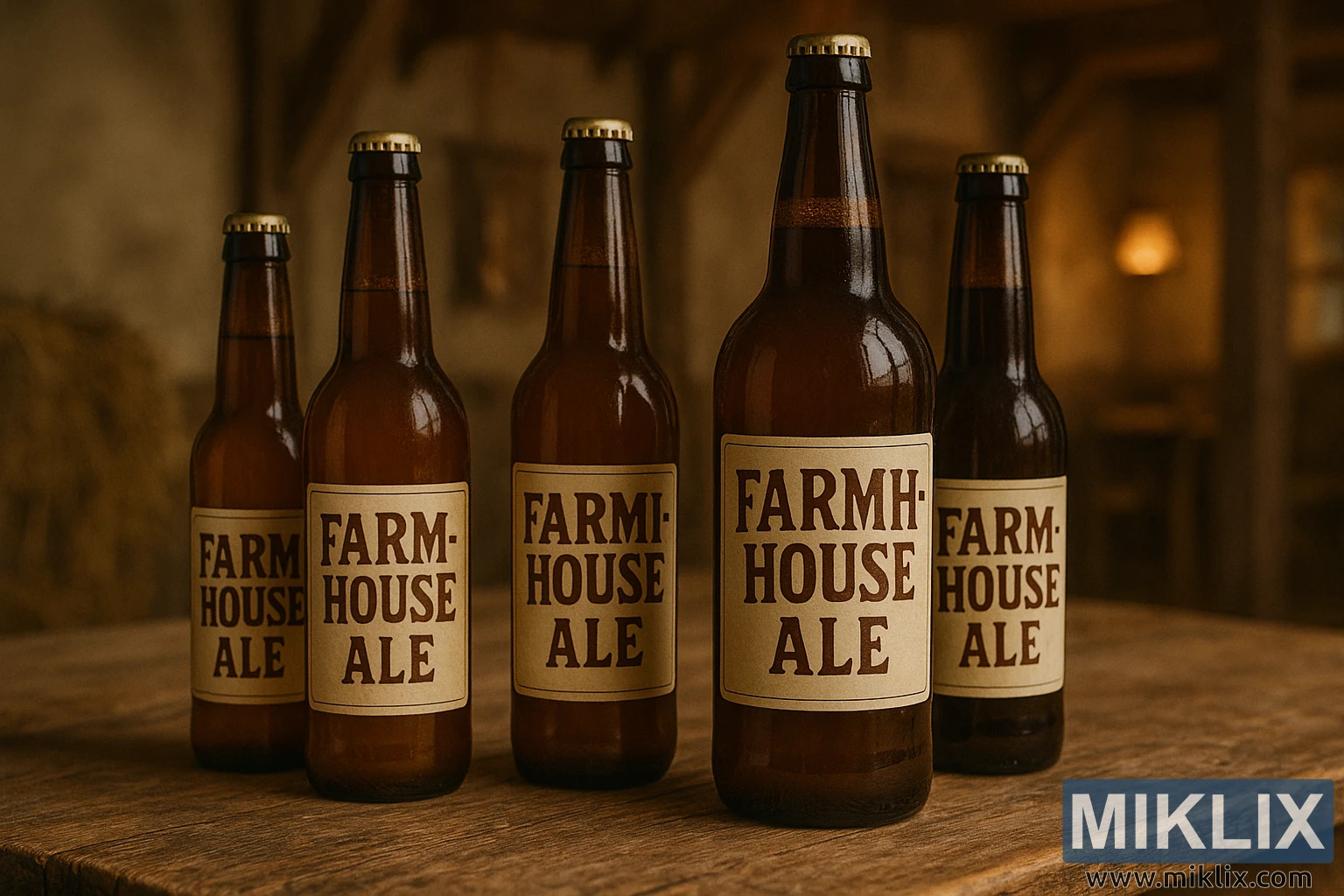 Attēla centrā nelielā arkā ir izvietotas piecas dažāda augstuma brūnas stikla pudeles, radot dziļumu un pievēršot skatītāja uzmanību no priekšplāna uz fonu. Katrai pudelei ir liela, ar rokām darināta etiķete ar treknrakstā, serifā veidotu tipogrāfiju, kurā rakstīts “FARMHOUSE ALE”. Uzraksts ir drukāts ar silti brūnu tinti uz krēmkrāsas, teksturēta papīra, kas rada sajūtu, ka tas ir uzklāts ar rokām, atspoguļojot “dari pats” garu un lauku alus darīšanas amatniecisko izcelsmi. Etiķetes nav uzkrītošas vai komerciālas; tā vietā tās rada klusu, pamatotu pārliecību, it kā tās būtu radītas ciešai pazinēju kopienai, nevis masu tirgus plauktiem.