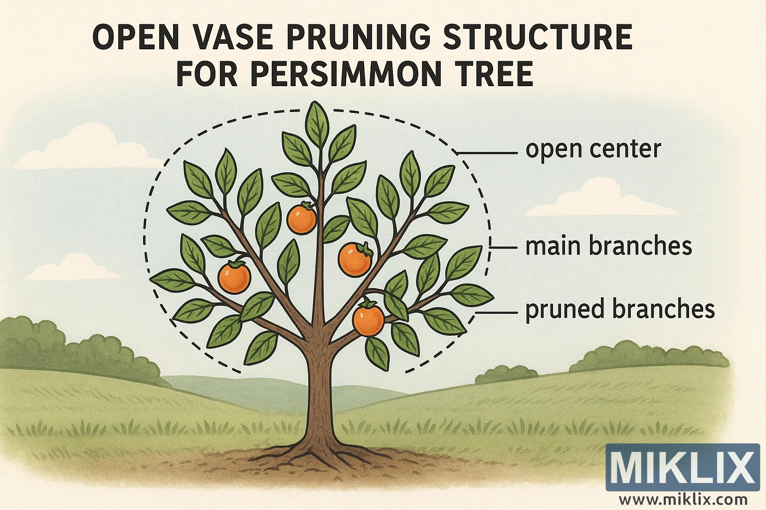Šajā izglītojošajā ilustrācijā attēlota ideāla atvērtā vāzes apgriešanas struktūra persimona kokam, kas paredzēta, lai palīdzētu augļu audzētājiem, dārzniekiem un dārzkopības studentiem pareizā koku apstrādē un kopšanā. Diagramma ir attēlota ainavas orientācijā ar maigiem, dabīgiem toņiem, kas novietota uz stilizēta lauku fona ar zaļiem pakalniem un gaiši zilām debesīm. Aina rada gan skaidrību, gan harmoniju, atspoguļojot struktūras un augšanas līdzsvaru, kas panākts, izmantojot pareizas apgriešanas prakses.