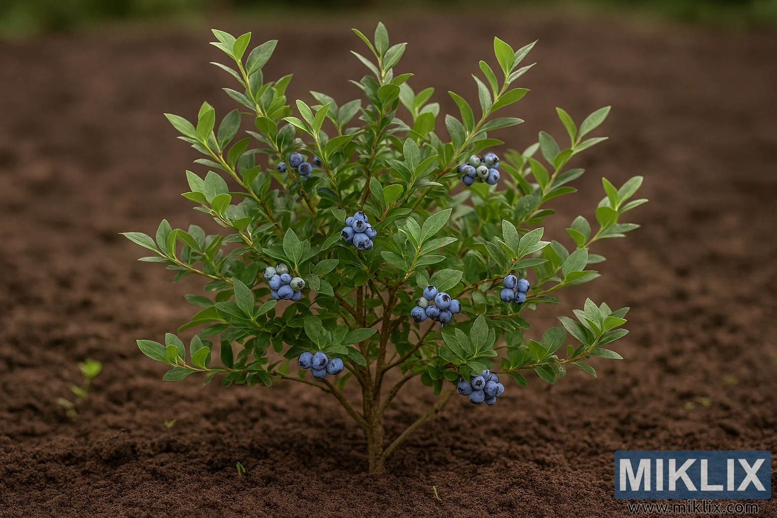 Fons ir maigi izplūdināts, izmantojot seklu asuma dziļumu, kas izolē krūmu un uzsver tā detaļas. Aiz augsnes līnijas ir redzamas citu dārza augu un zaļumu pazīmes, piešķirot kontekstu, nenovēršot uzmanību no galvenā objekta. Apgaismojums ir maigs un izkliedēts, visticamāk, no skaidrām debesīm vai vieglas mākoņu segas, metot smalkas ēnas, kas izceļ augsnes tekstūru un lapu un ogu kontūras.