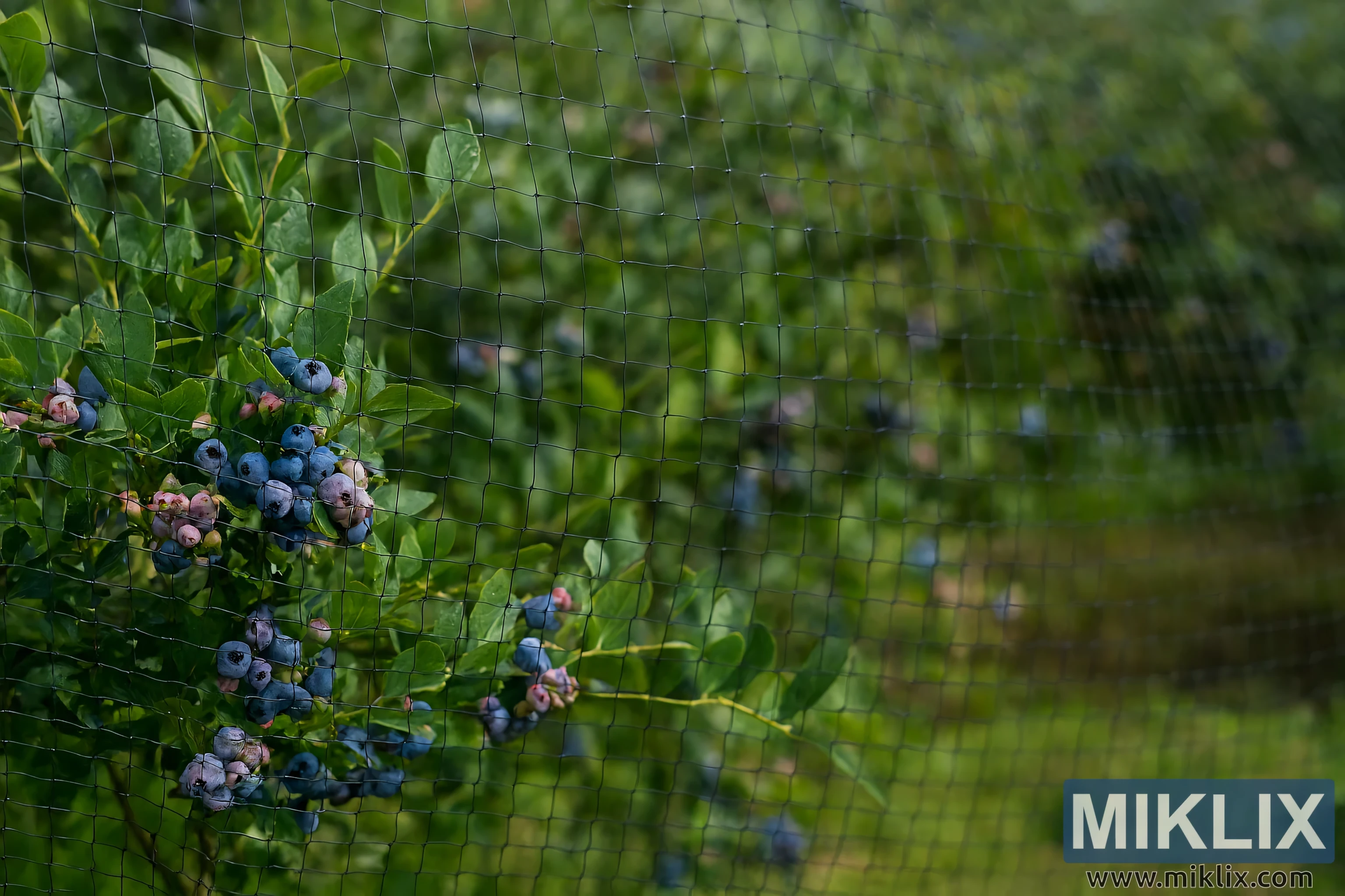 Šajā attēlā redzama mierīga dārza aina, kur virs plaukstošu melleņu krūmu rindas rūpīgi uzstādīts putnu tīkls. No smalka, melna sieta izgatavotais tīkls ir nostiepts pāri krūmu augšdaļai un sāniem, veidojot aizsargbarjeru pret putniem. Tā režģveida raksts rada smalku pārklājumu, kas ļauj saules gaismai iespīdēt, vienlaikus saglabājot zemāk esošo augu redzamību. Tīkls ir droši nostiprināts pie mietiem un maigi pārklāj krūmu kontūras, saplūstot ar dabisko apkārtni, neaizsedzot skatu.