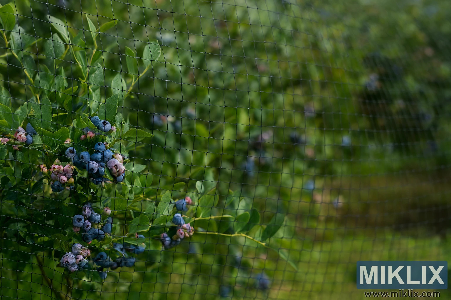 Detalizēts skats uz putnu tīklu, kas izstiepts pāri košiem melleņu krūmiem, izceļot nogatavojušās ogas un sulīgu lapotni vasaras dārzā.