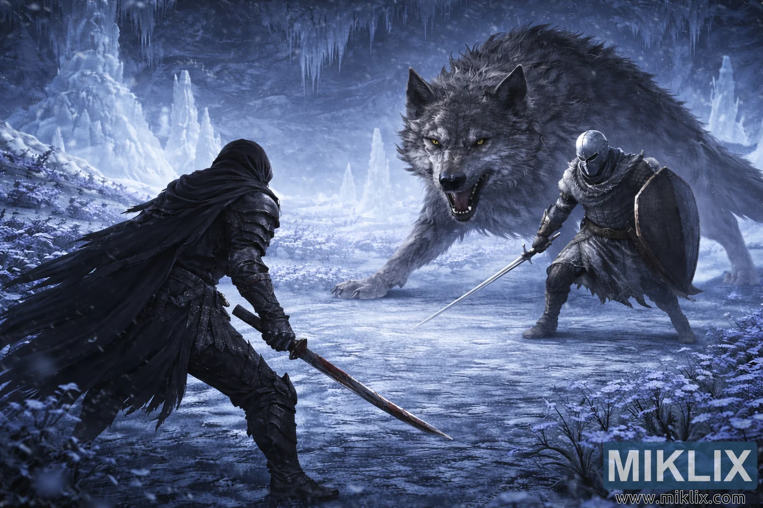 Pretī vientuļajam karotājam, kas atrodas labajā viduslaukumā, bet tagad ir novietots daudz tuvāk nekā iepriekš, stāv draudīgie pretinieki. Bruņotais Kapu tīkotājs turas aiz apaļa vairoga, vienlaikus izstiepjot taisnu zobenu aizsardzības pozīcijā, kājas stingri novietotas uz slidenās, sasalušās virsmas. Viņa bruņas izskatās izturīgas un kaujās rētainas, kaltas no klusinātiem sudraba un dzelzs toņiem, kas smalki atspoguļo apkārtējo kristālisko gaismu. Aiz viņa un nedaudz virs viņa slejas milzīgais Lielvilks, tā kolosālais ķermenis dominē kompozīcijas augšējā labajā daļā un ar taustāmu svaru slejas uz priekšu. Bieza kažoka kārta, kas veidota ar slāņotiem ogles, šīfera un tērauda pelēkiem triepieniem, viļņojas gar tā ķermeni, katru šķipsnu akcentējot ar maigu malas apgaismojumu, kas atdala zvēru no alas sienām. Tā mirdzošās dzintara acis caururbj blāvo zilo dūmaku, un no tā atvērtajiem žokļiem izgriežas vājas, salnas elpas vētras, pastiprinot apkārtējās vides brutālo aukstumu. Vilka nolaista galva un uz priekšu noliektā stāja liecina par atturīgu mežonību, muskuļi redzami savijušies zem blīvā kažoka, it kā jebkurā brīdī būtu gatavs mesties pāri ledum.