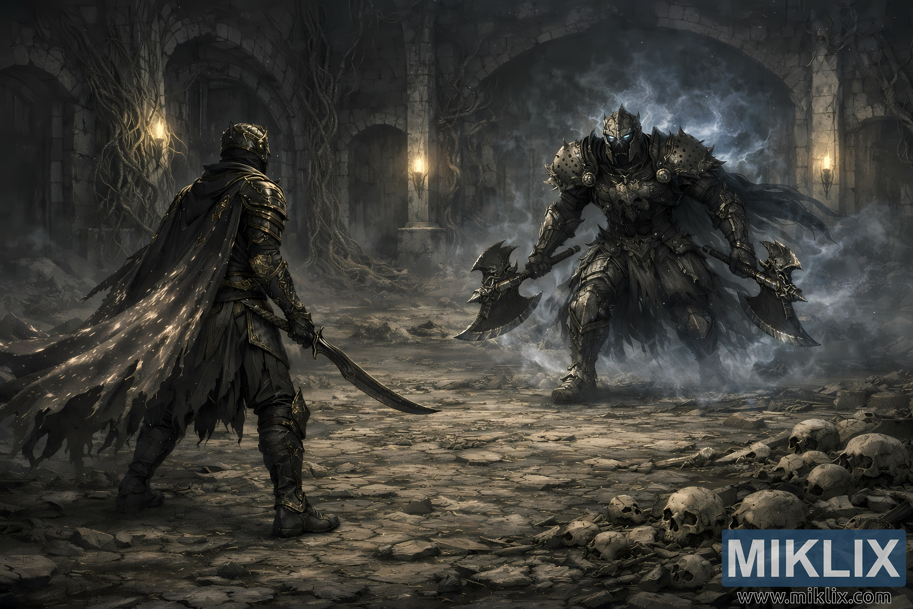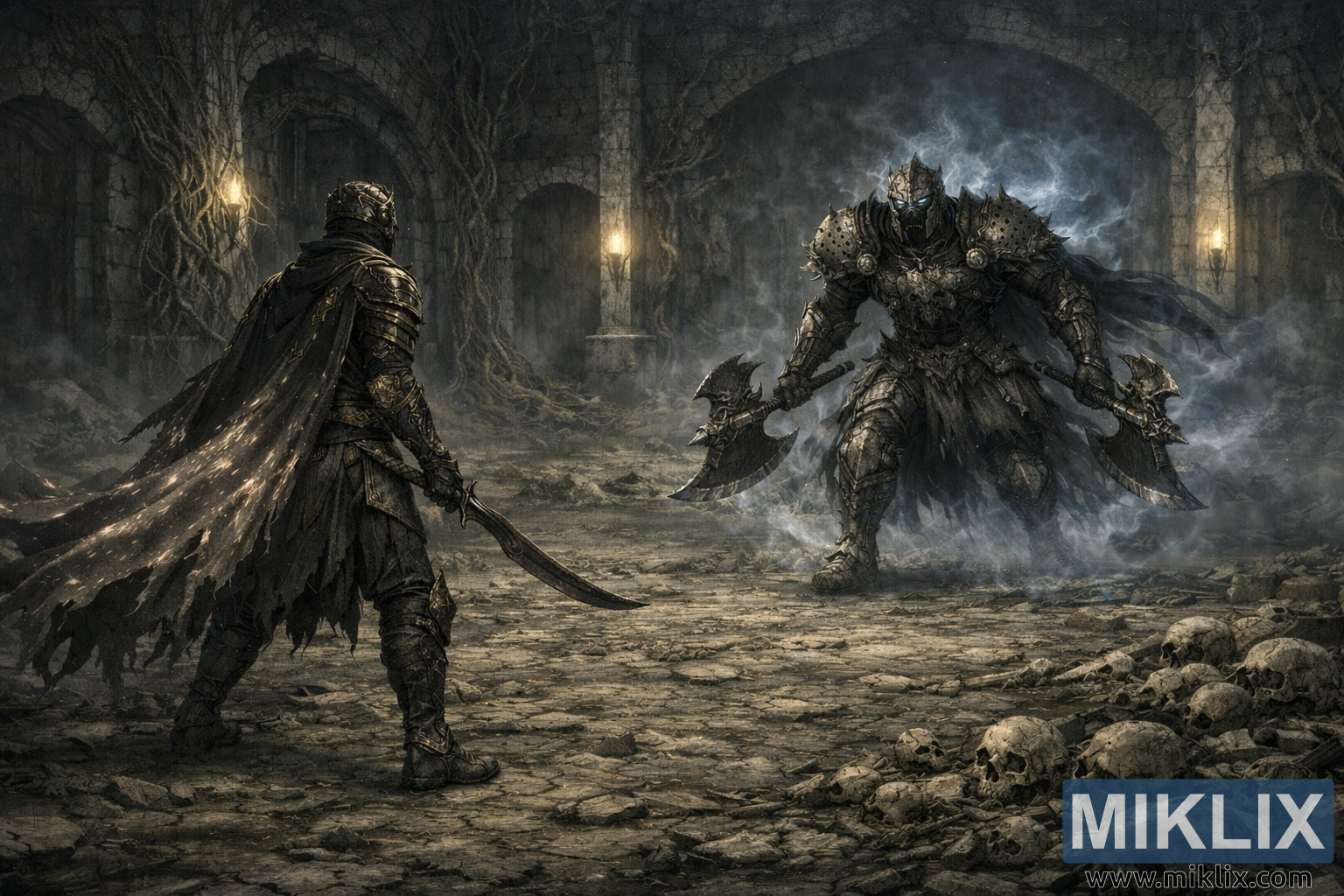 Zeme starp tiem ir plata un nekārtīga, noklāta ar saplaisājušām akmens plāksnēm, sadragātiem kauliem un galvaskausu puduriem, kas sakrauti labajā priekšplānā. Šīs atliekas tagad ir labāk redzamas, pastiprinot to, cik daudz citu ir krituši tieši šajā telpā. Migla nolaižas zemu, aptverot gan lāpu, gan Nāves bruņinieka spokaino auru, radot siltas un aukstas gaismas slāņus, kas sadala telpu nemierīgās zonās. Atklājot vairāk fona — arkas, kas izgaist miglā, saknes, kas skrāpē akmeni, un garo tukšo grīdu, kas atdala varoni un briesmoni —, attēls uzsver ne tikai gaidāmās cīņas spriedzi, bet arī pašu katakombu nomācošo, seno svaru. Tas ir elpu aizturējis mirklis, klusums pirms spēcīgas vētras.