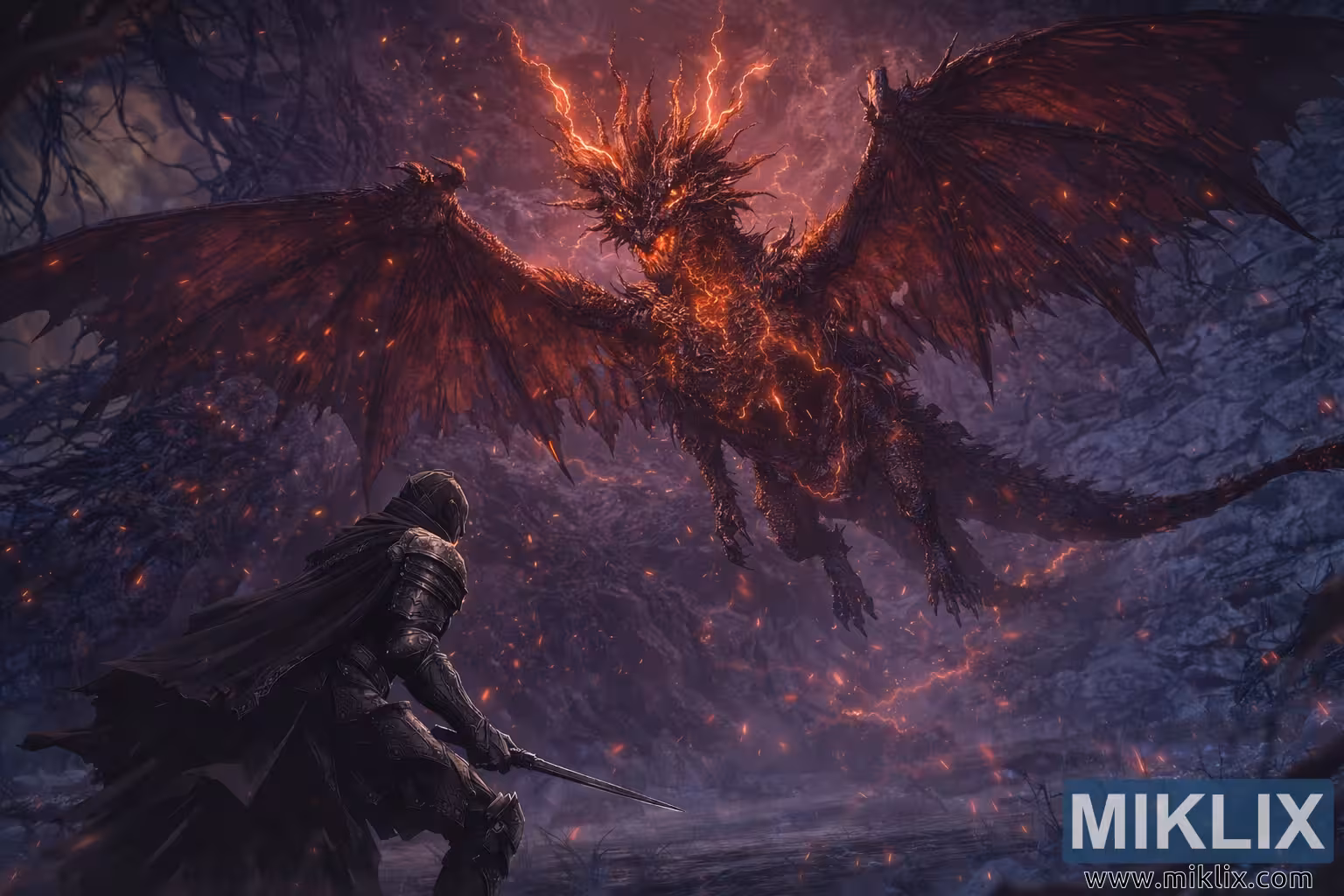 Kopumā attēls iemūžina apturētu brīdi tieši pirms trieciena — elpu, kas aizturēta starp zemi un debesīm. Tas uzsver mērogu, izolāciju un nepakļāvību, iemiesojot Elden Ring pamattēmas. Anime iedvesmotais stils izceļ asas siluetes, dramatisko apgaismojumu un kinematogrāfisko kadrējumu, pārveidojot tikšanos spēcīgā vizuālā stāstījumā par vientuļu karotāju, kurš izaicina nemirstīgu pūķa dievu aizmirstā, trūdošā pasaulē.